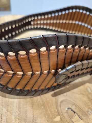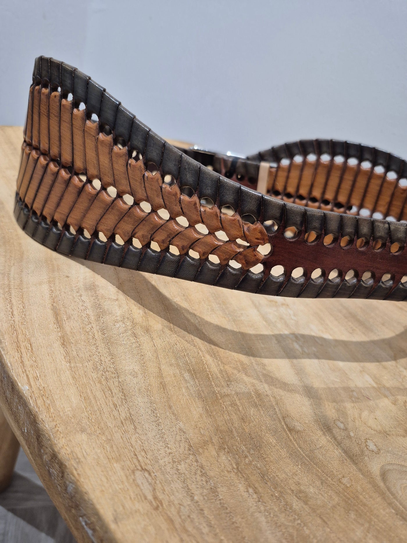 Crafted from genuine leather with a distinctive shaped silhouette, this perforated waist belt brings understated elegance to any outfit. Woven in rich natural leather tones, warm tan, earthy khaki, and deep chocolate, each piece is unique.