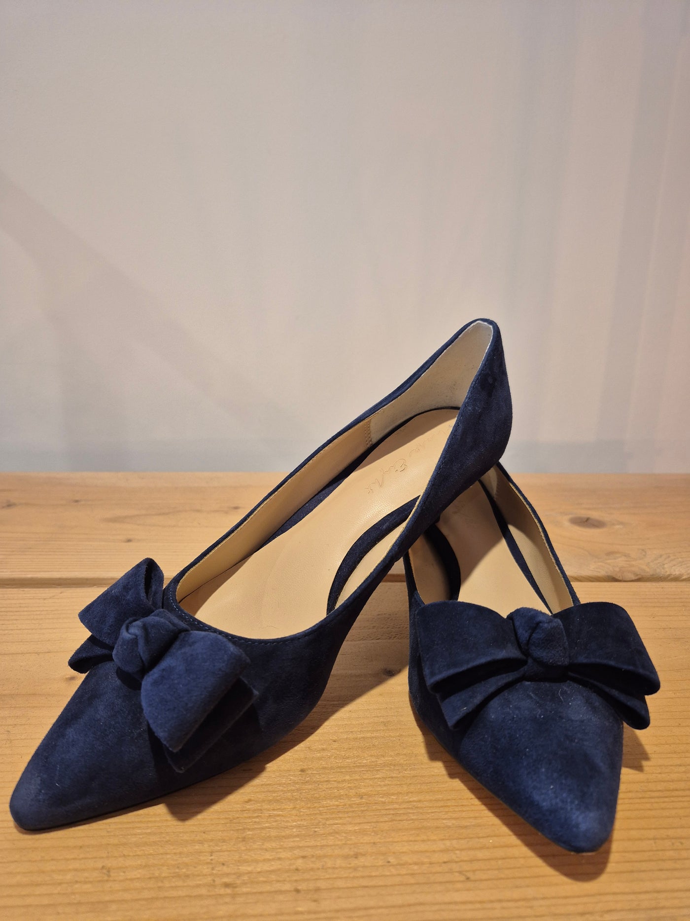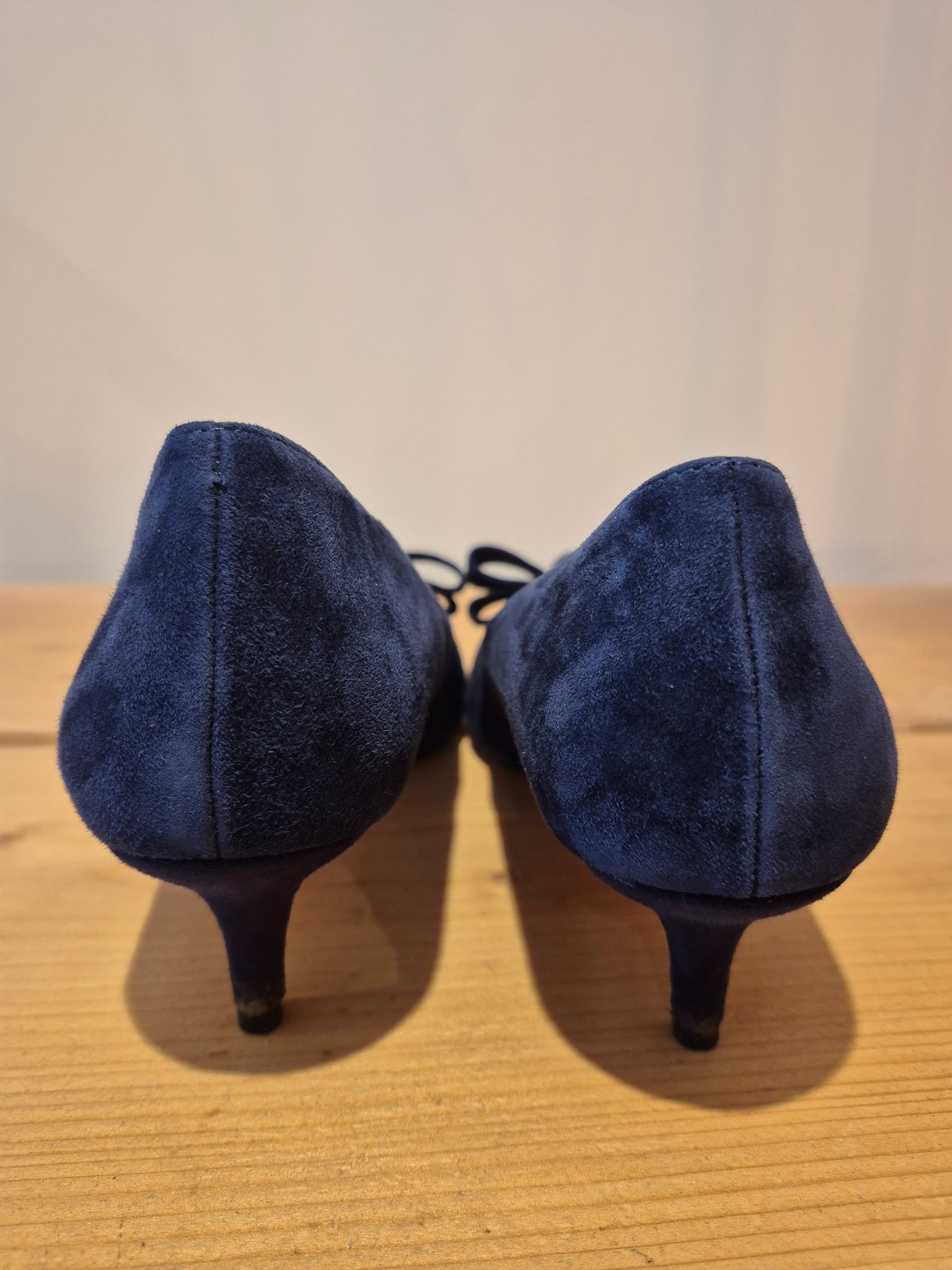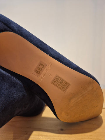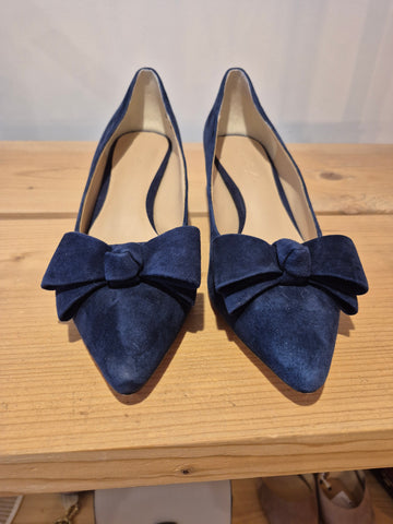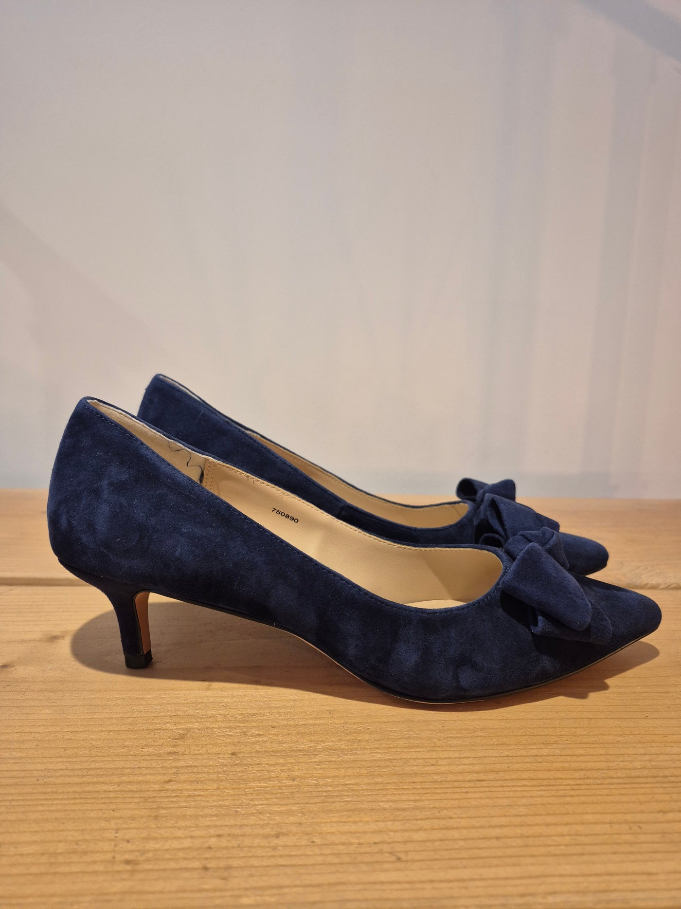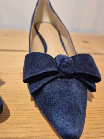 These preloved Phase Eight suede kitten heels are both elegant and practical for those special occasions. In a soft kid suede they have a heel height of just over 2", soft pointed toe and feature a double knot bow.