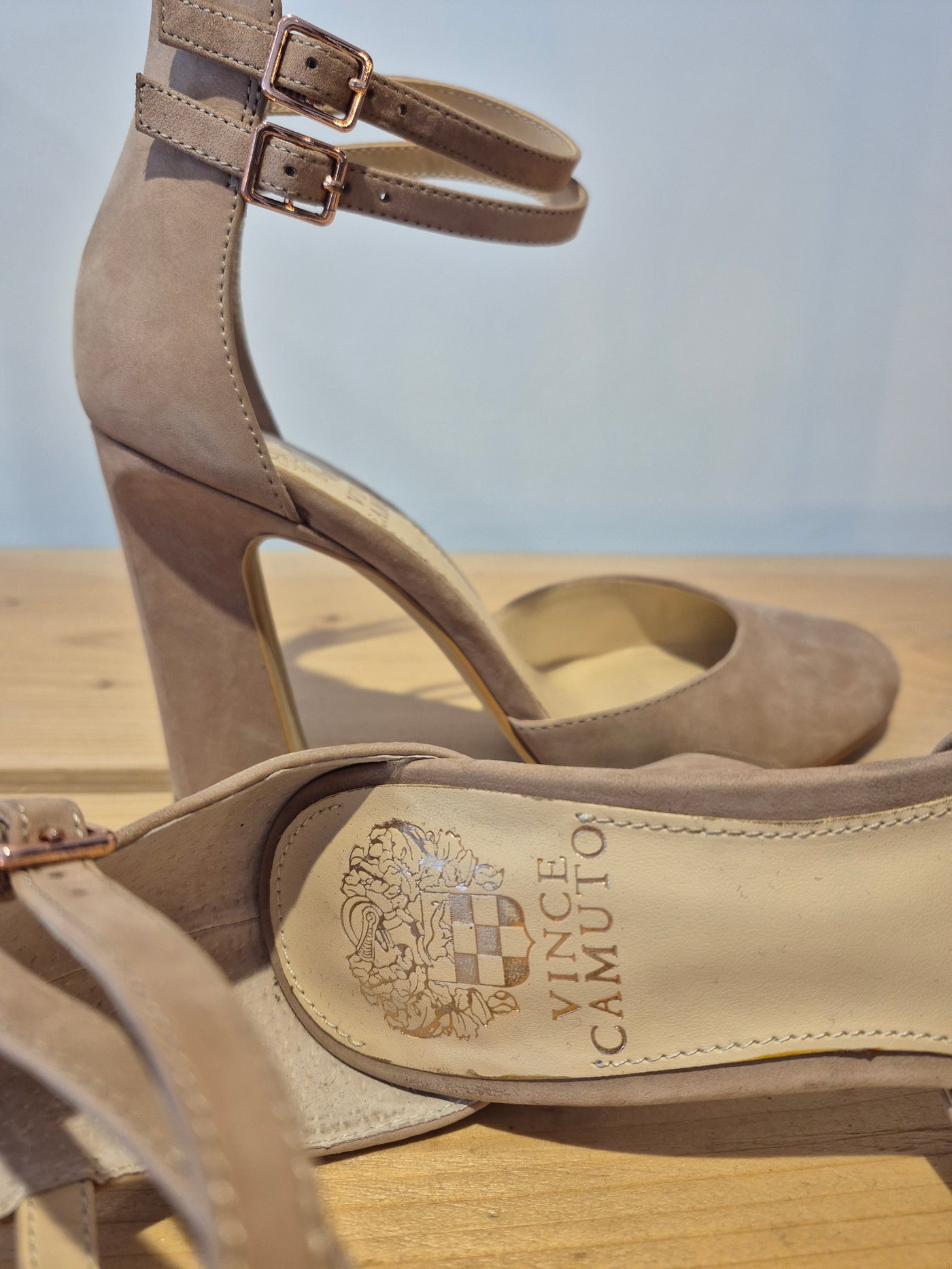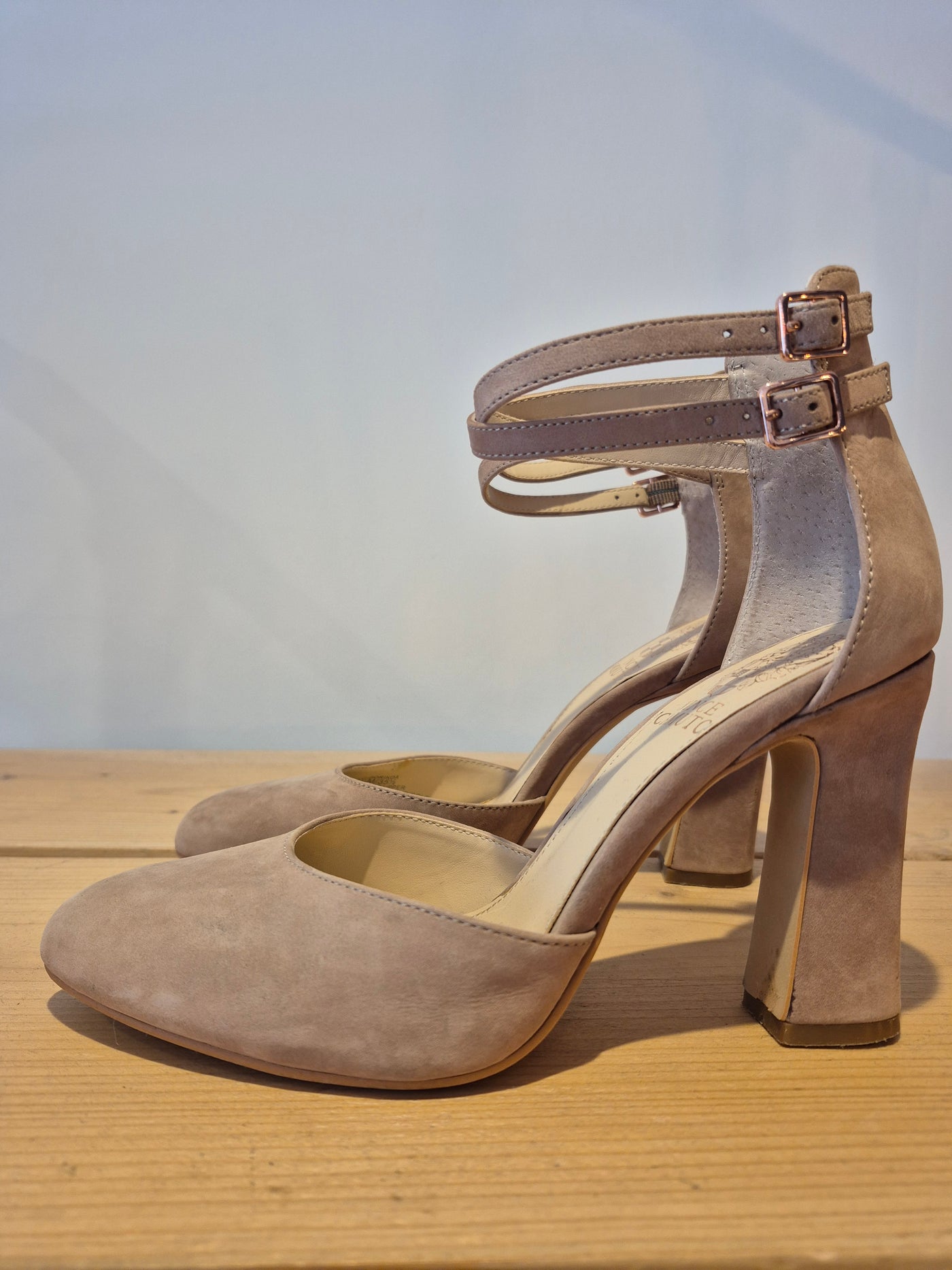 We love these preloved Vince Camuto suede occasion shoes. In a soft suede with shaped heel they are so feminine, perfect to pair with your floaty dresses for those summer events and so practical for the races! We believe they are the popular 'Dorinda Pump' style with double ankle strap fastening and soft shaped almond toe.