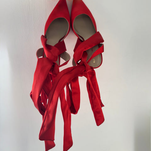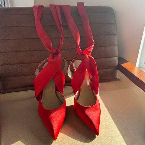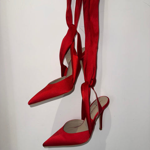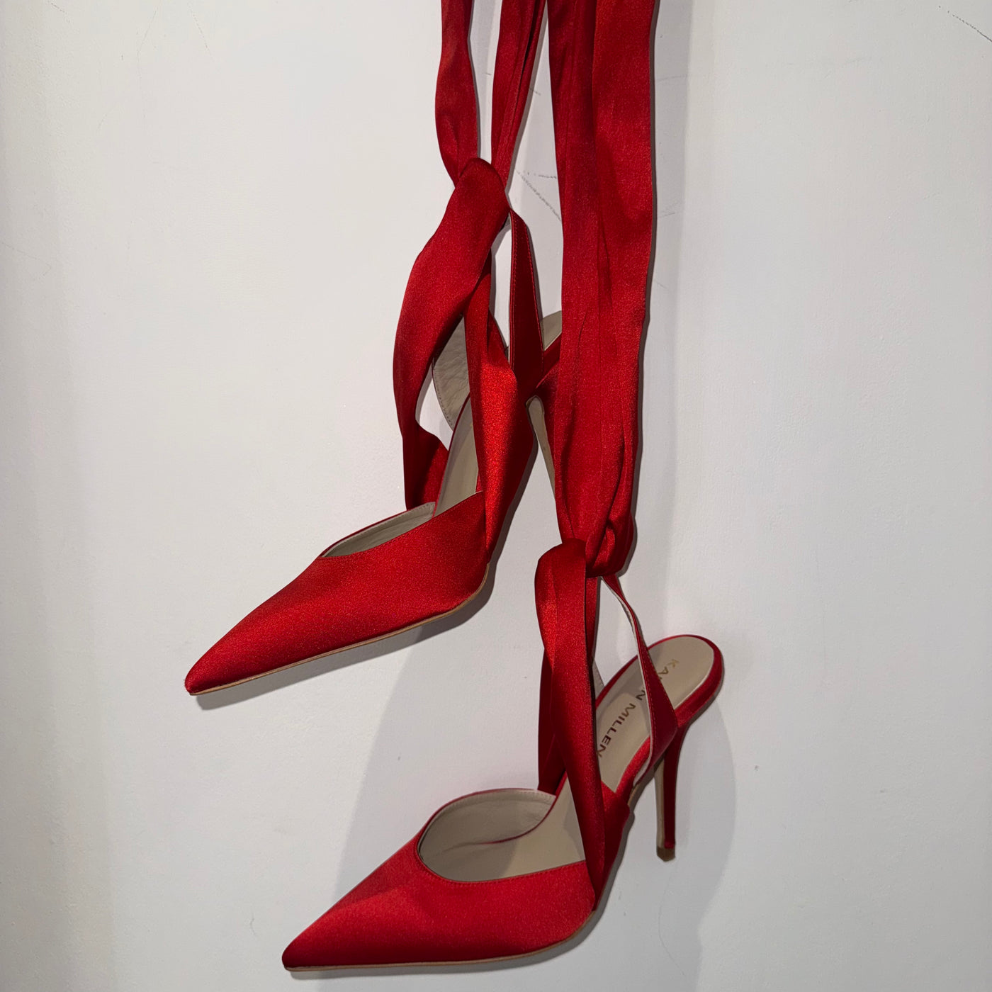 These Karen Millen pointed court shoes are crafted from premium satin with a leather lining and resin sole, ideal for occasion wear. Featuring beribboned ties to beautifully frame the leg and a slender stiletto heel for an elegant silhouette.
