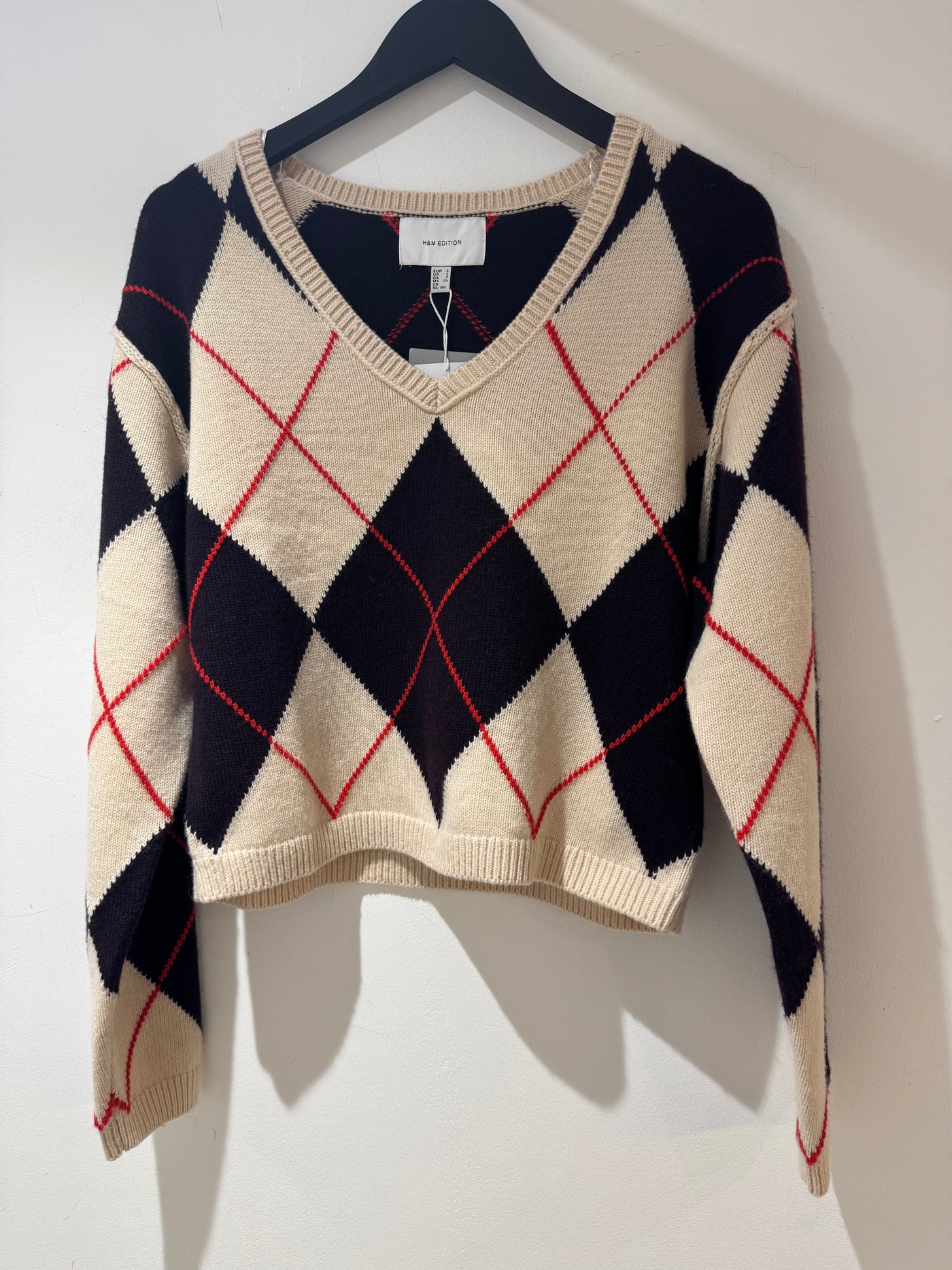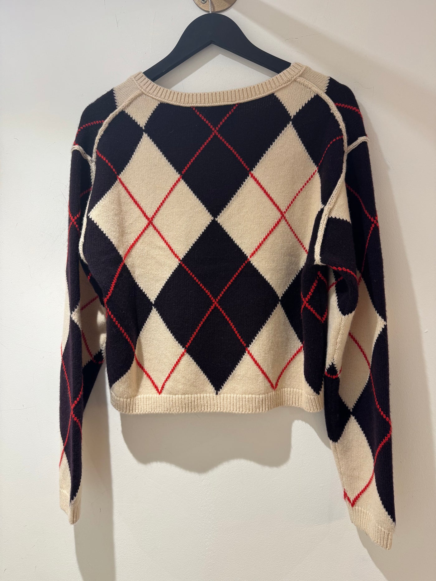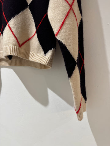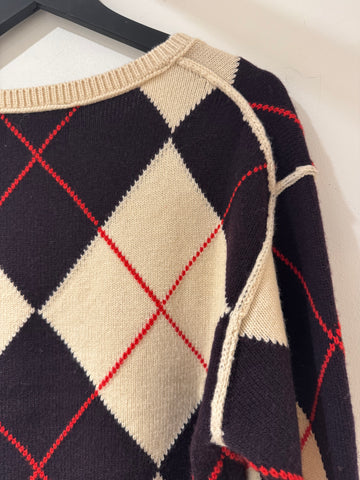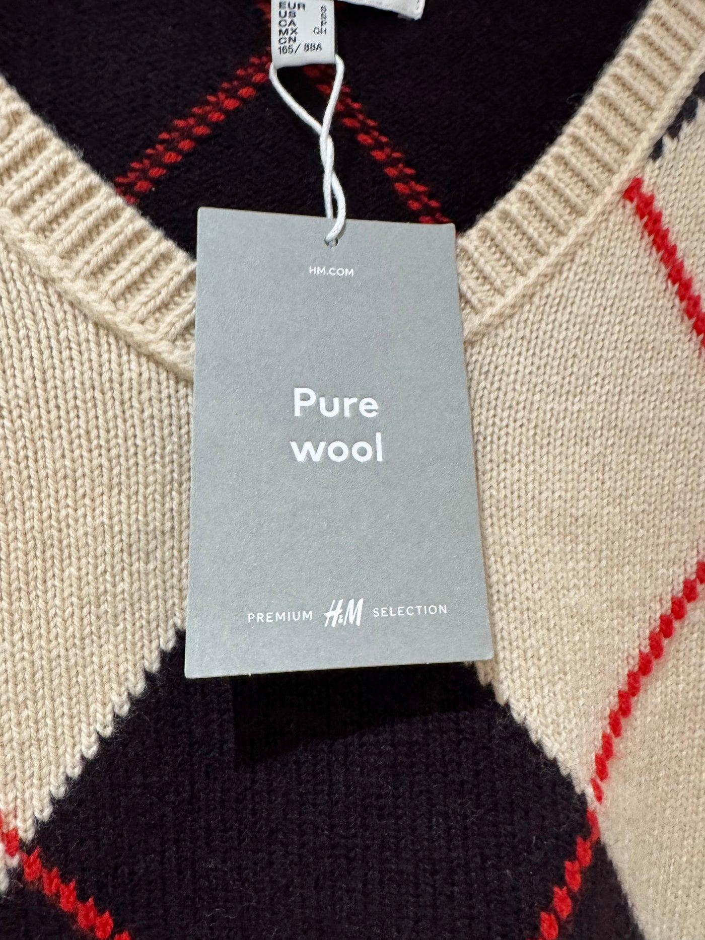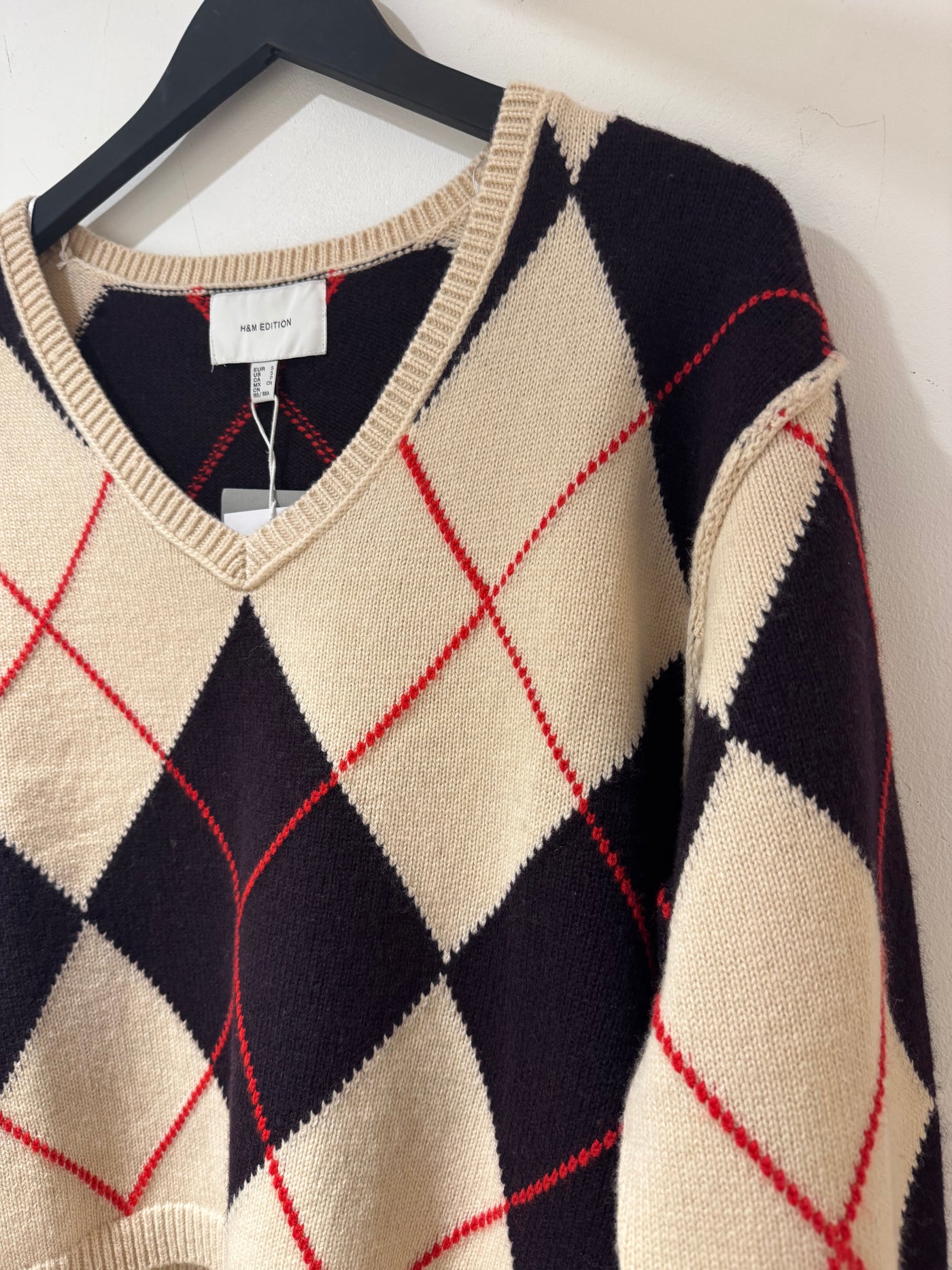 Embrace sustainable style with this H&M Edition wool jumper in a classic navy, red, and cream colour way. Perfect for layering through winter, this preloved piece delivers warmth without compromising on style.