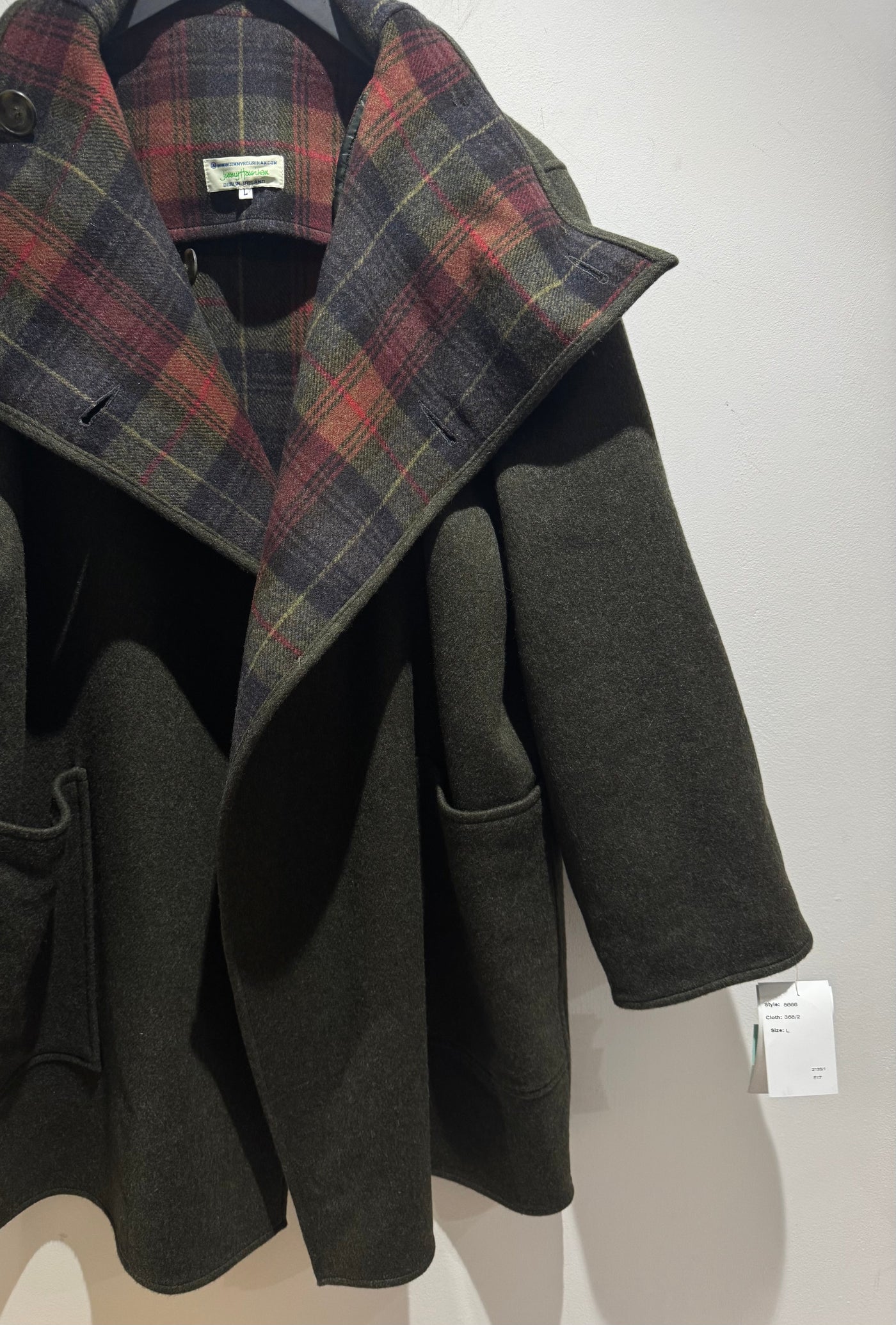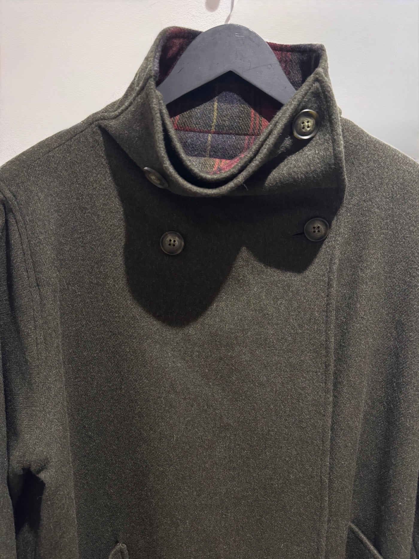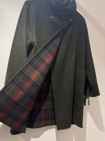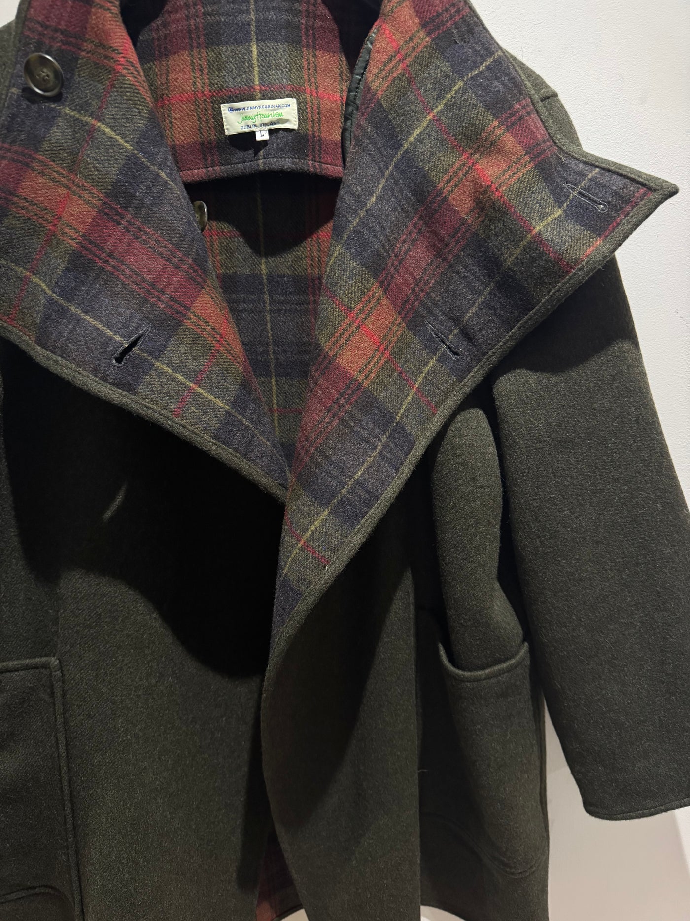 A beautifully tailored Jimmy Hourihan khaki coat, crafted in pure new wool for warmth, structure, and timeless elegance. Finished with a striking tartan-lined cape detail for a classic, elevated look.