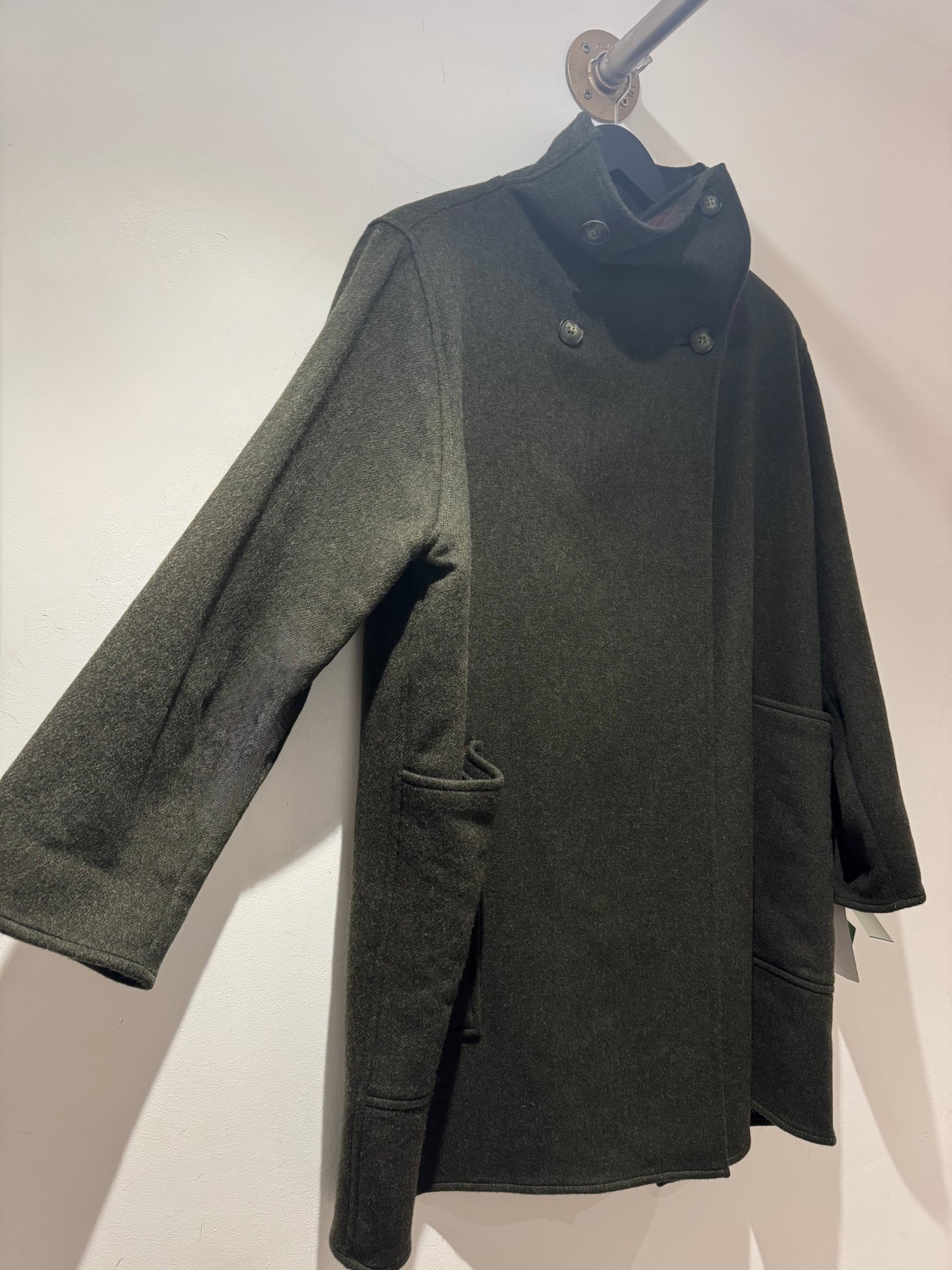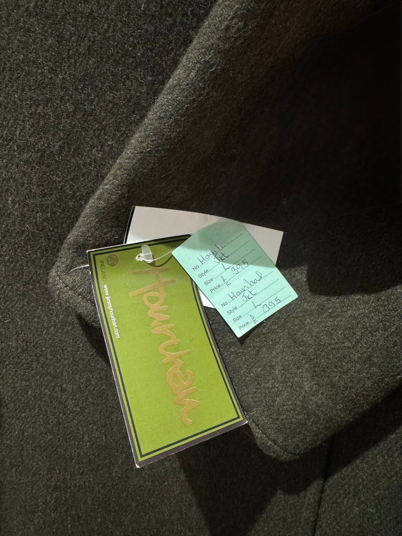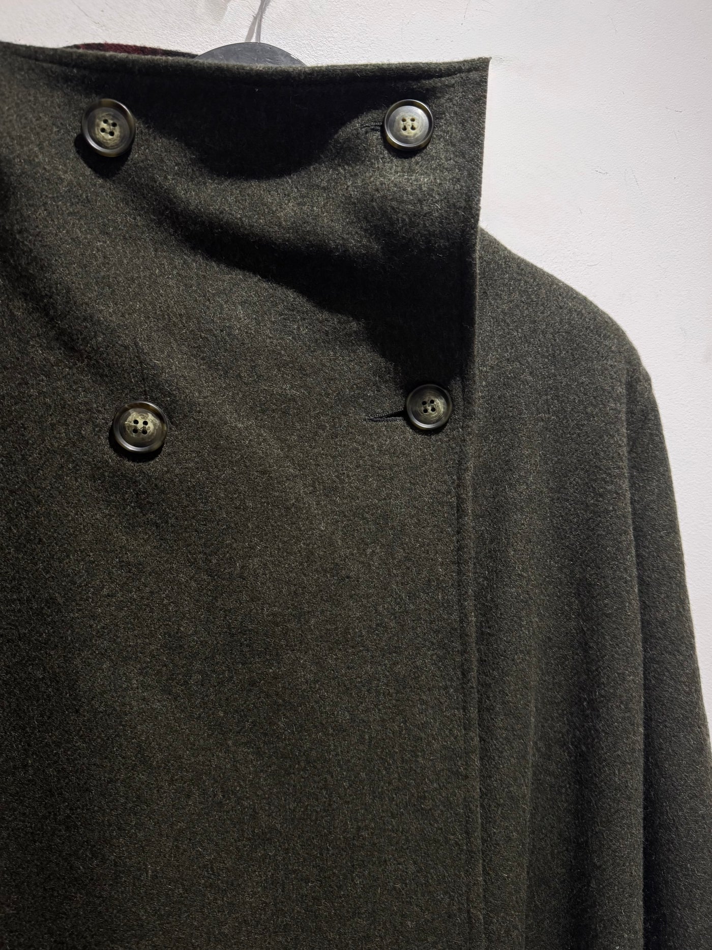 A beautifully tailored Jimmy Hourihan khaki coat, crafted in pure new wool for warmth, structure, and timeless elegance. Finished with a striking tartan-lined cape detail for a classic, elevated look.