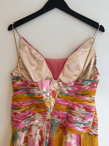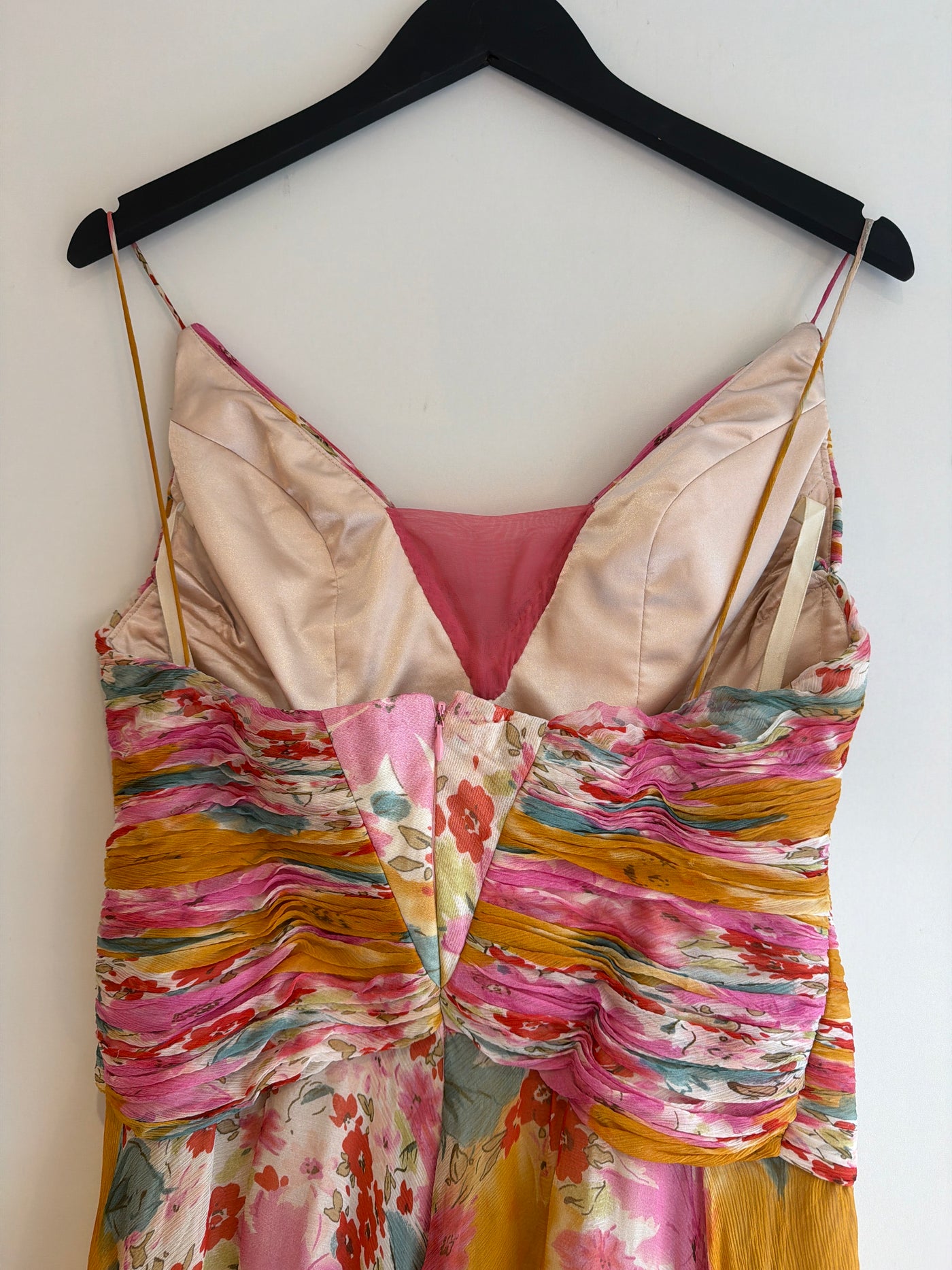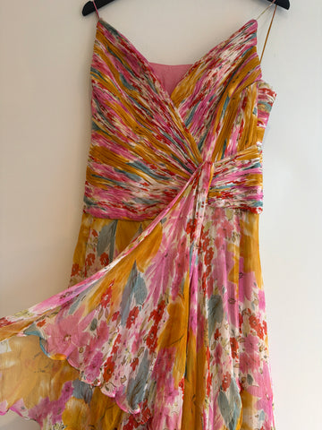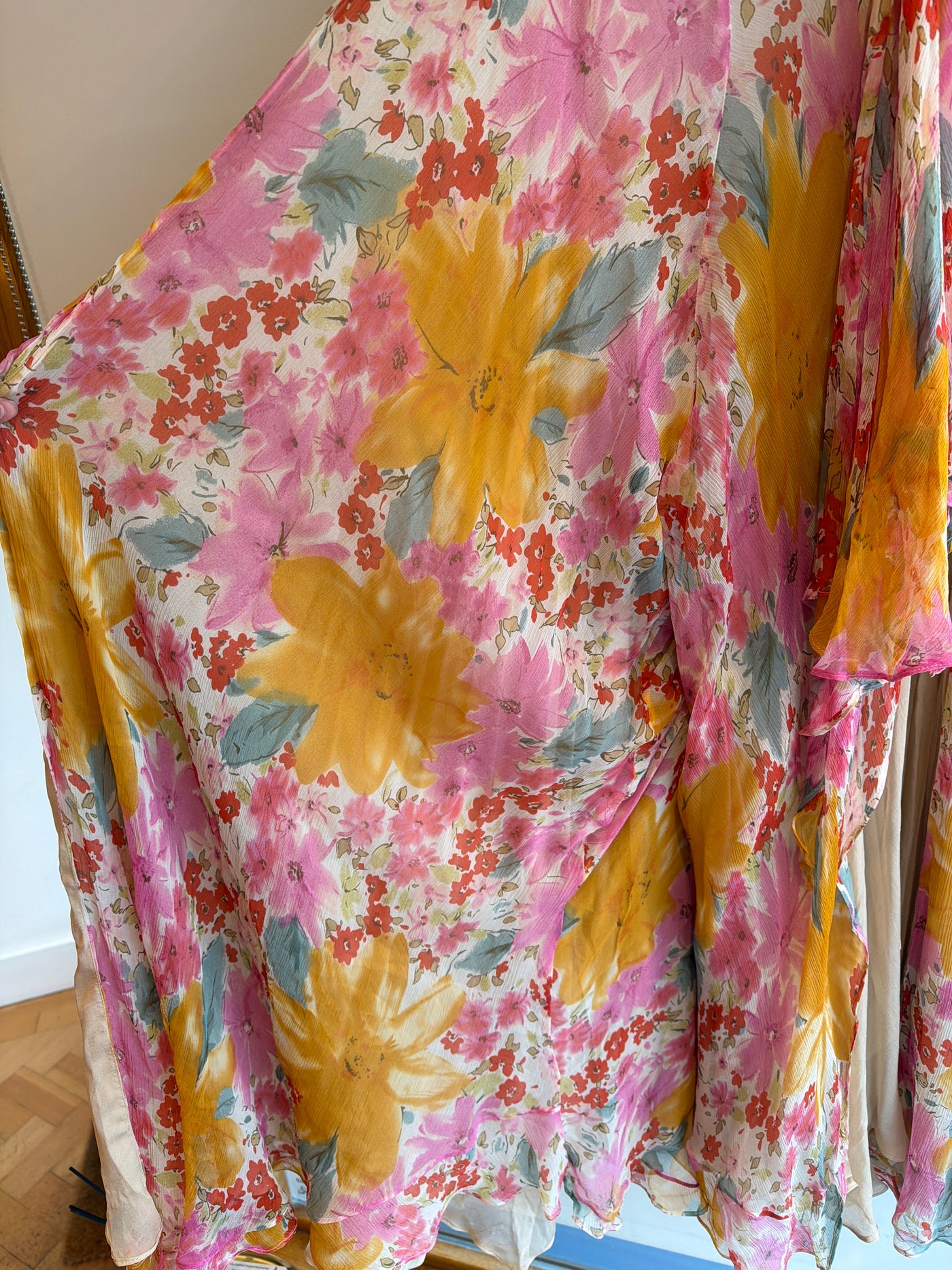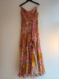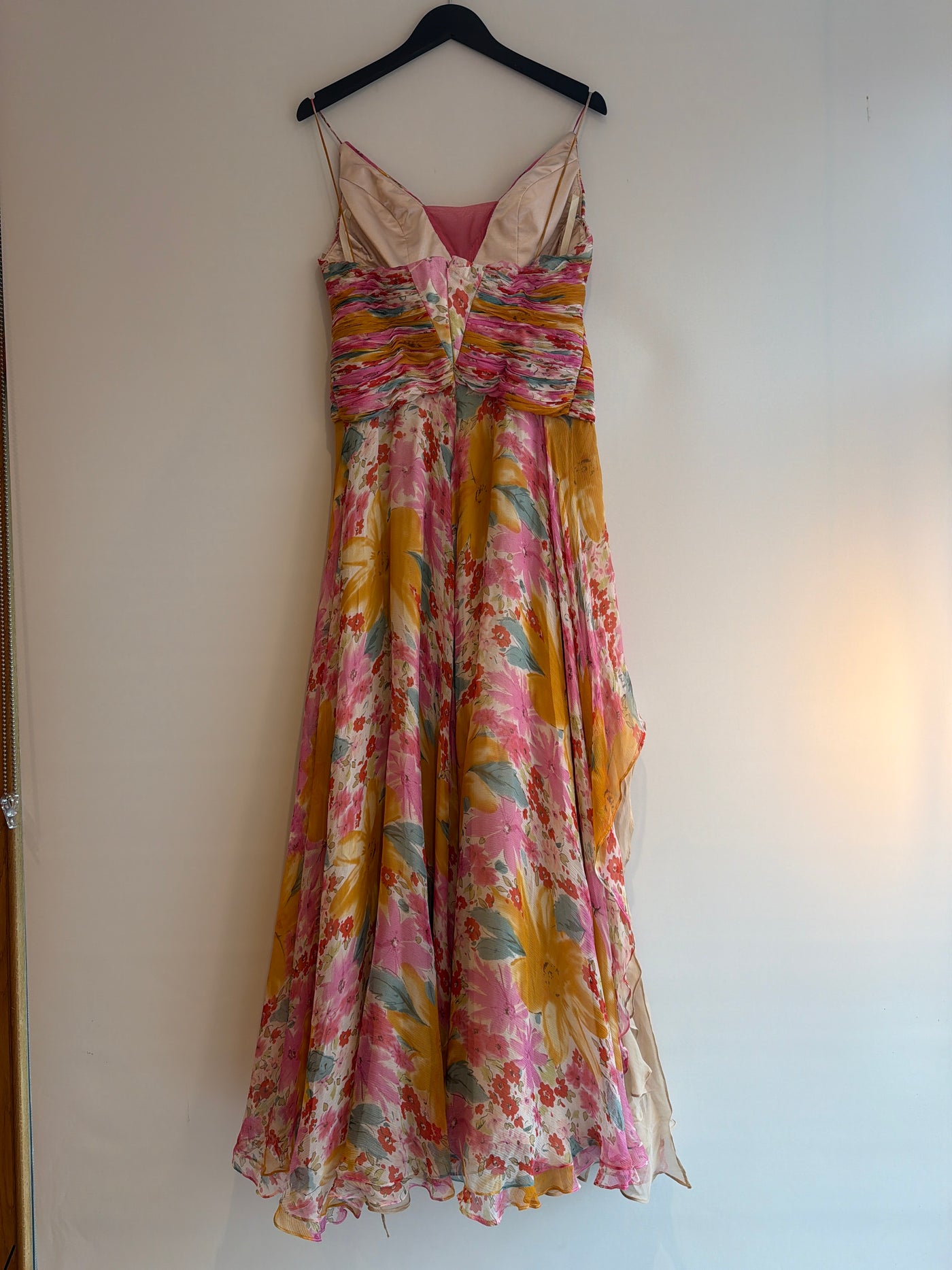 This Jovani silk print jumpsuit is one of our favourite vintage pieces currently in store. Beautifully crafted from high-quality silk, with pleated bodice, it offers a luxurious feel and elegant drape, making it suitable for various special occasions.