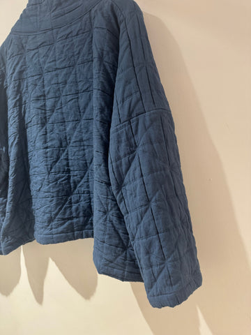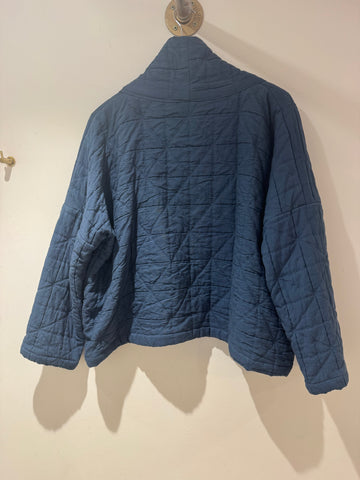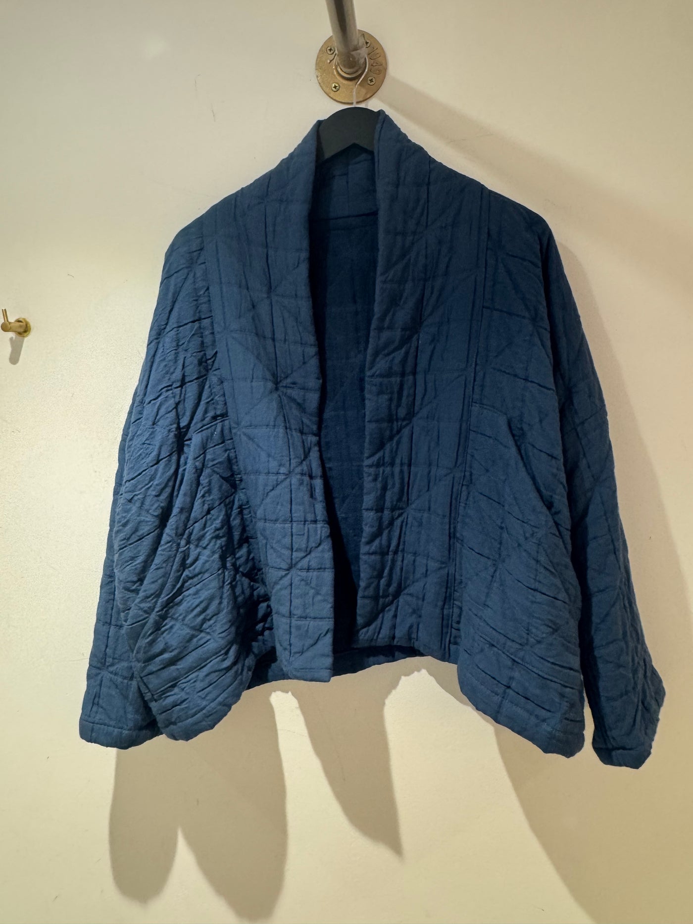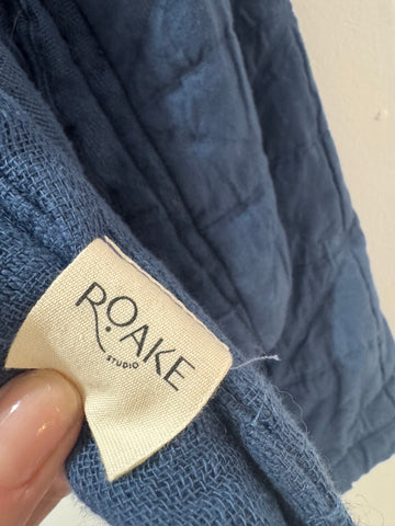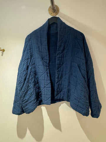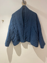 A beautifully crafted Roake Studio cotton jacket in a rich blue tone, featuring a unique handmade feel with a softly quilted texture. This relaxed, open-front piece is perfect for effortless layering and adds a distinctive artisanal touch to any outfit.