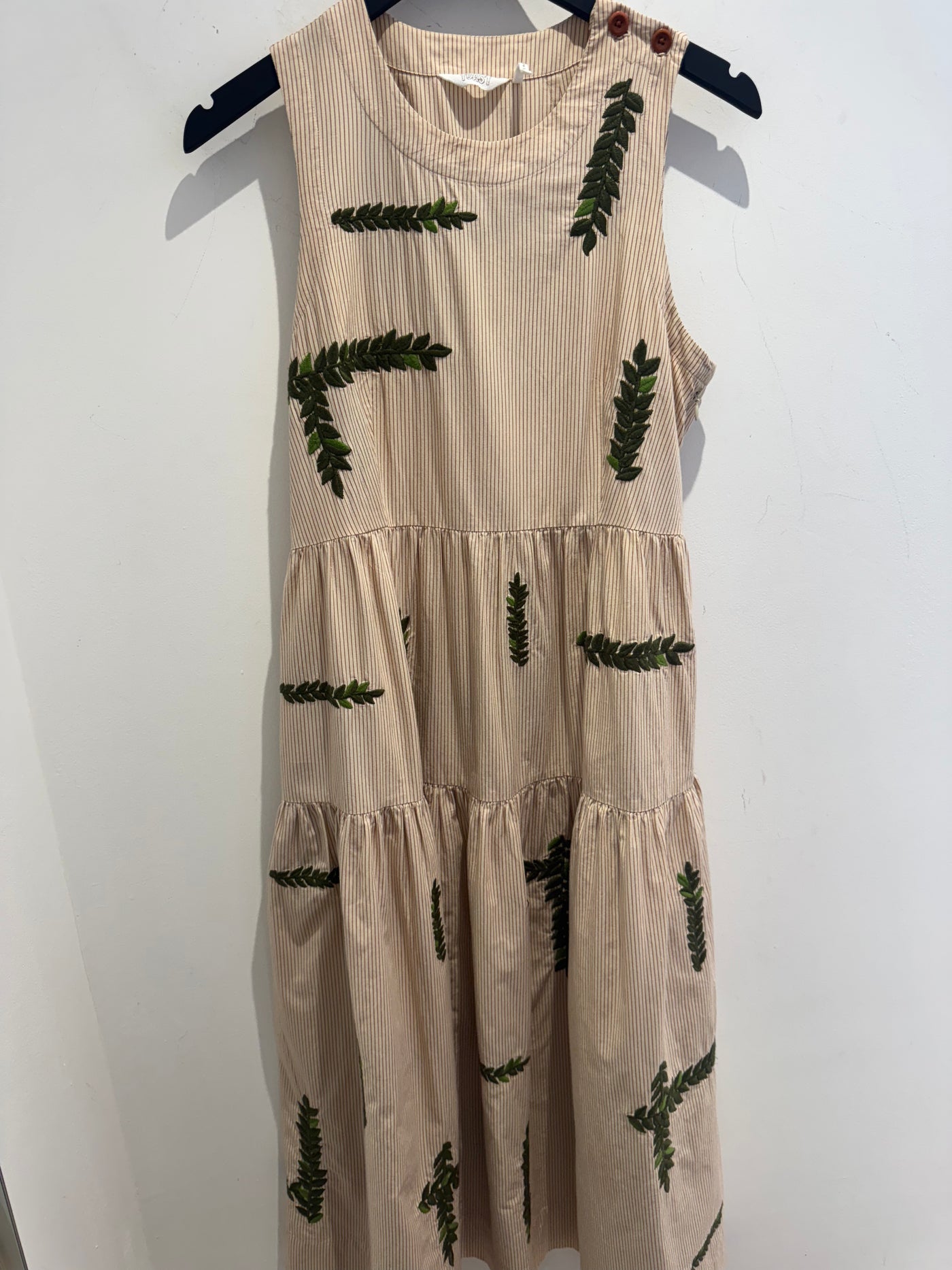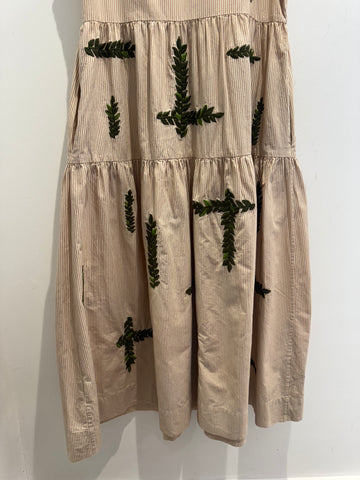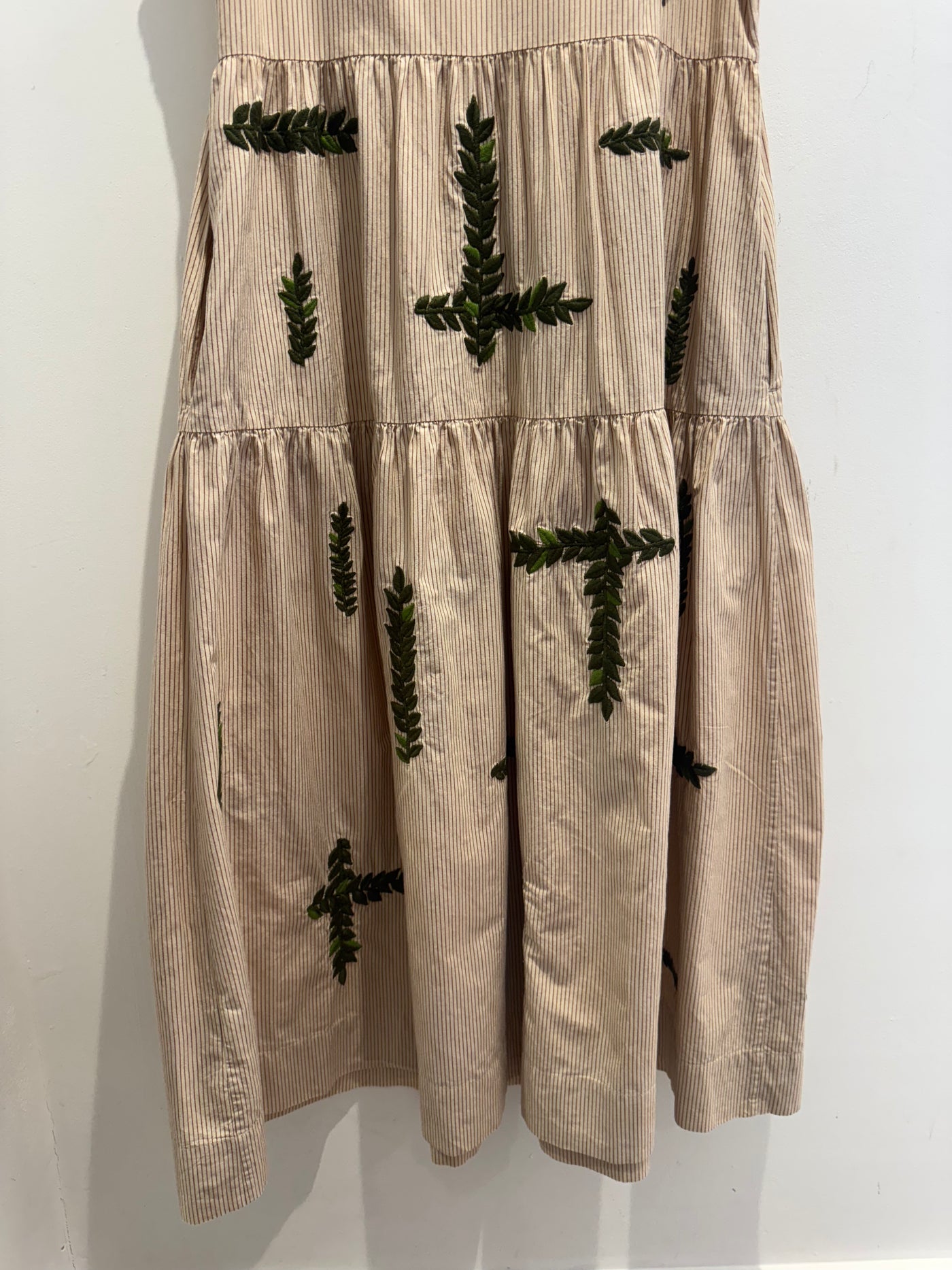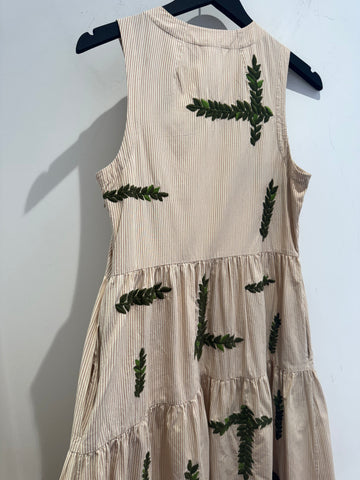 A beautifully crafted Toast sundress in soft cream tones, detailed with embroidered green leaf motifs and subtle stripe texture for a relaxed, artisanal feel.