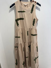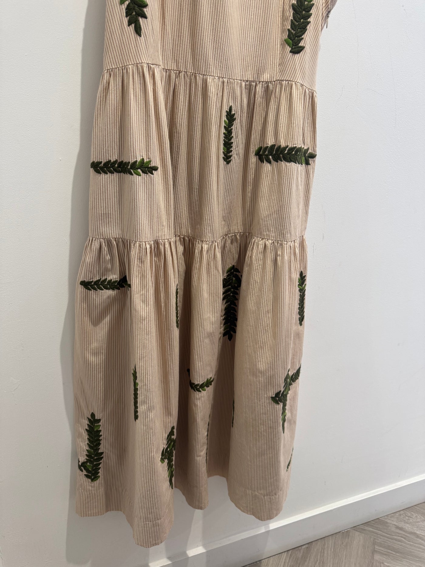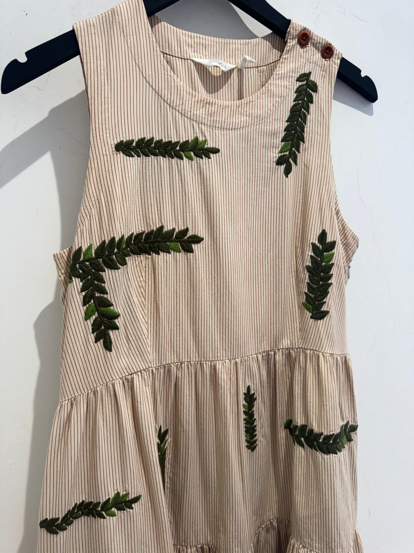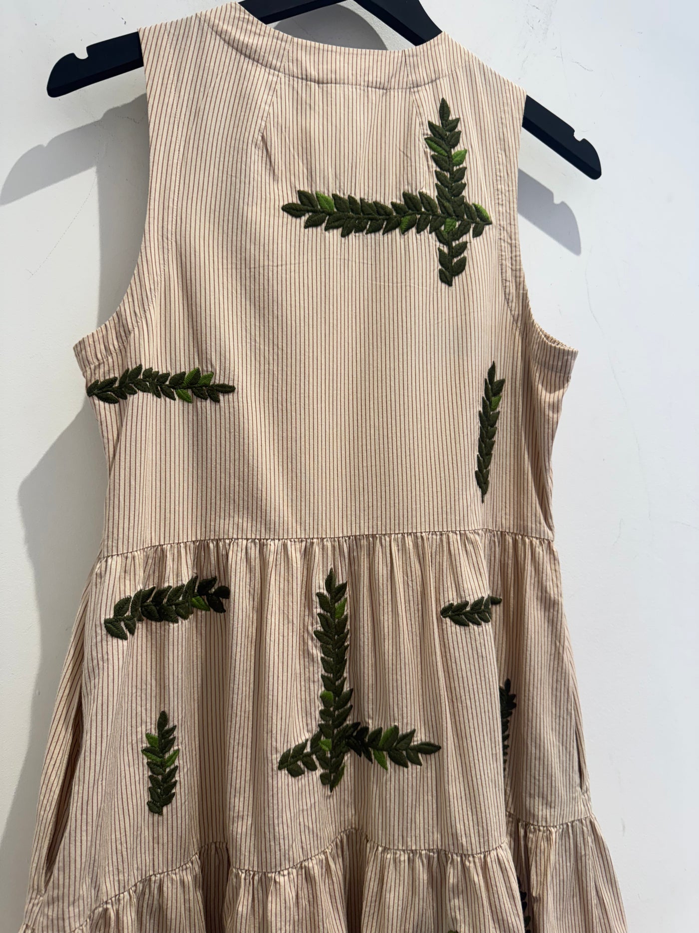 Sleeveless sundress style Tiered skirt silhouette Embroidered leaf detailing Subtle stripe texture throughout Soft, breathable cotton Easy, relaxed fit