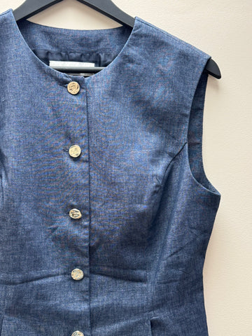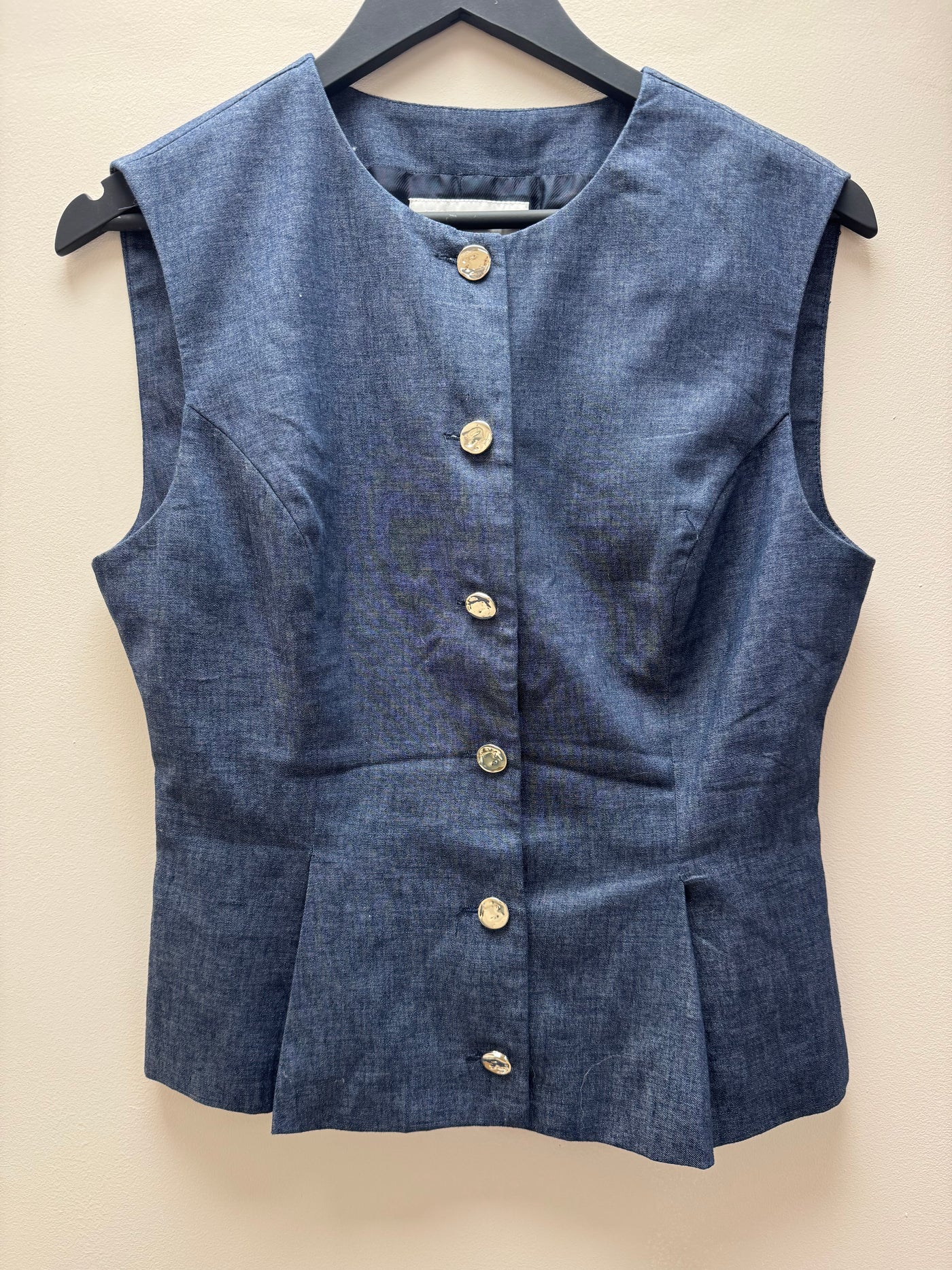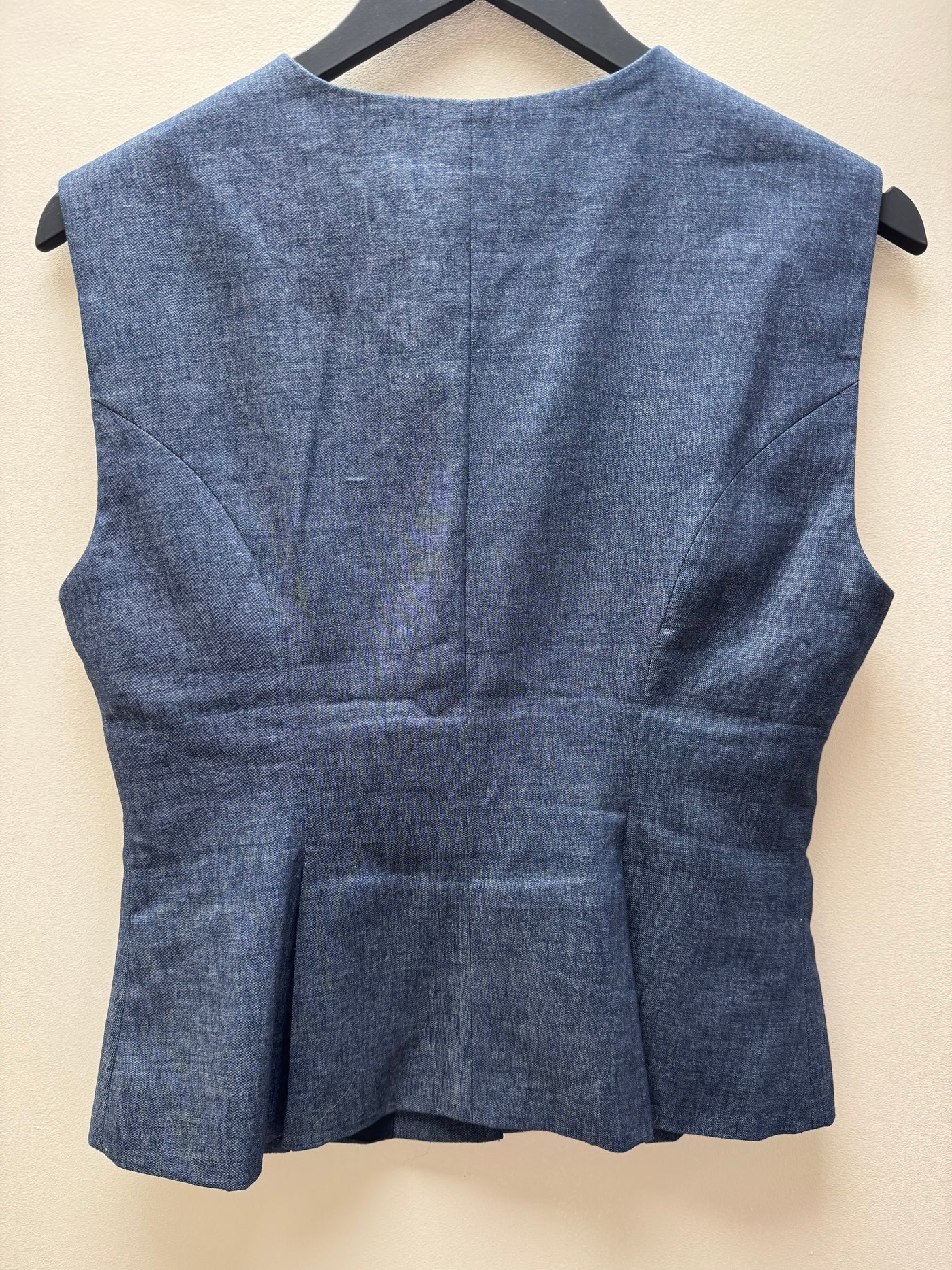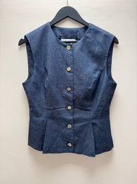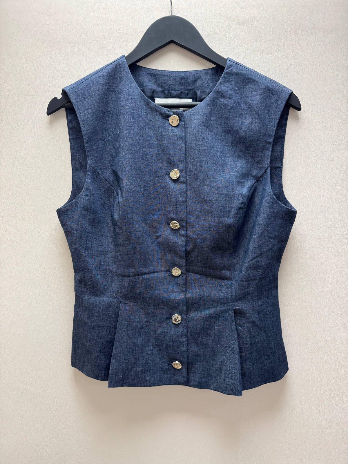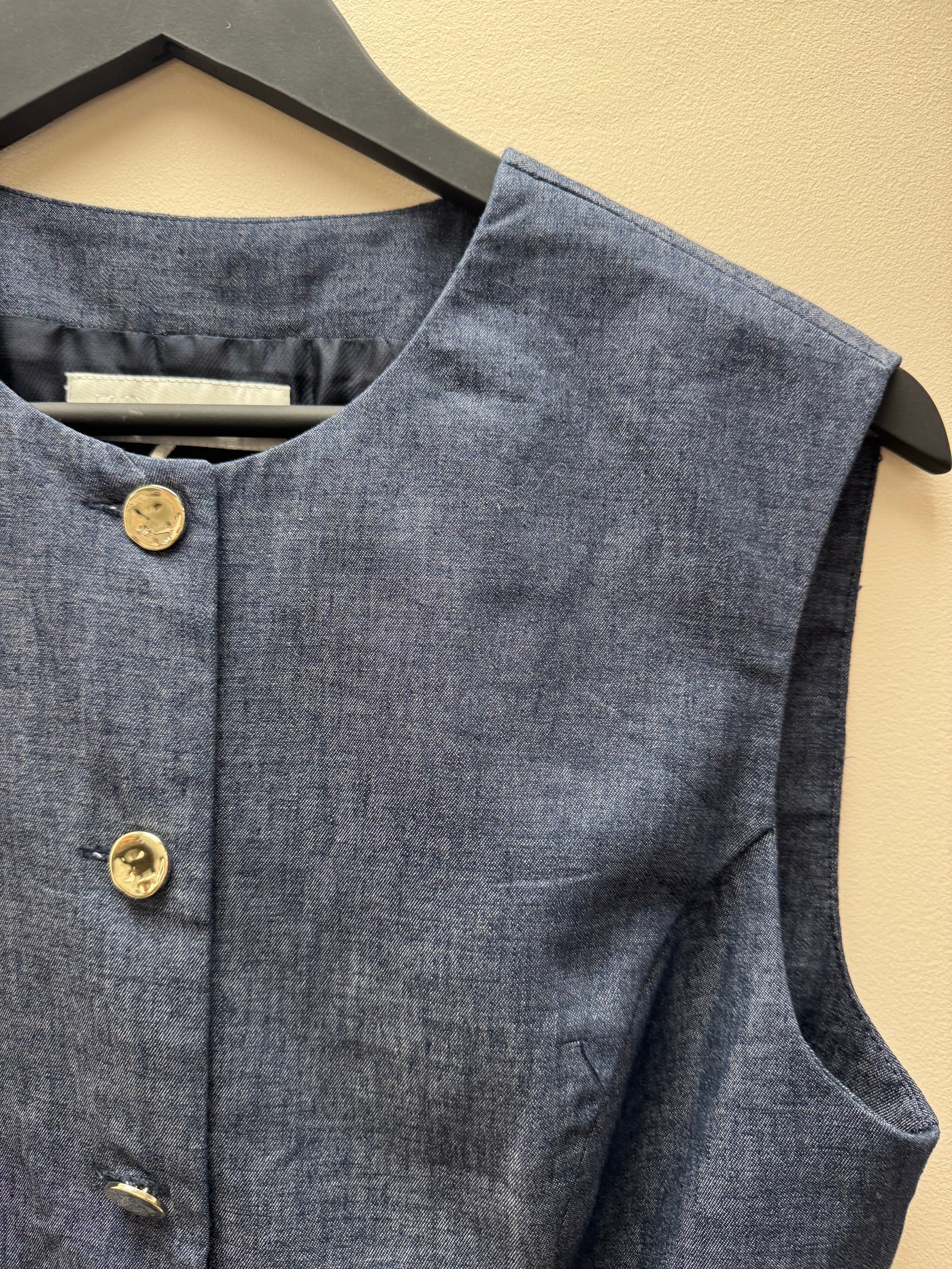 A fresh take on a classic layer, this blue chambray waistcoat from Zara offers effortless versatility. Designed with a clean round neckline and a sleeveless silhouette, it adds a modern touch to both casual and smart-casual looks. The metal button fastening at the front gives it a refined, contemporary finish.