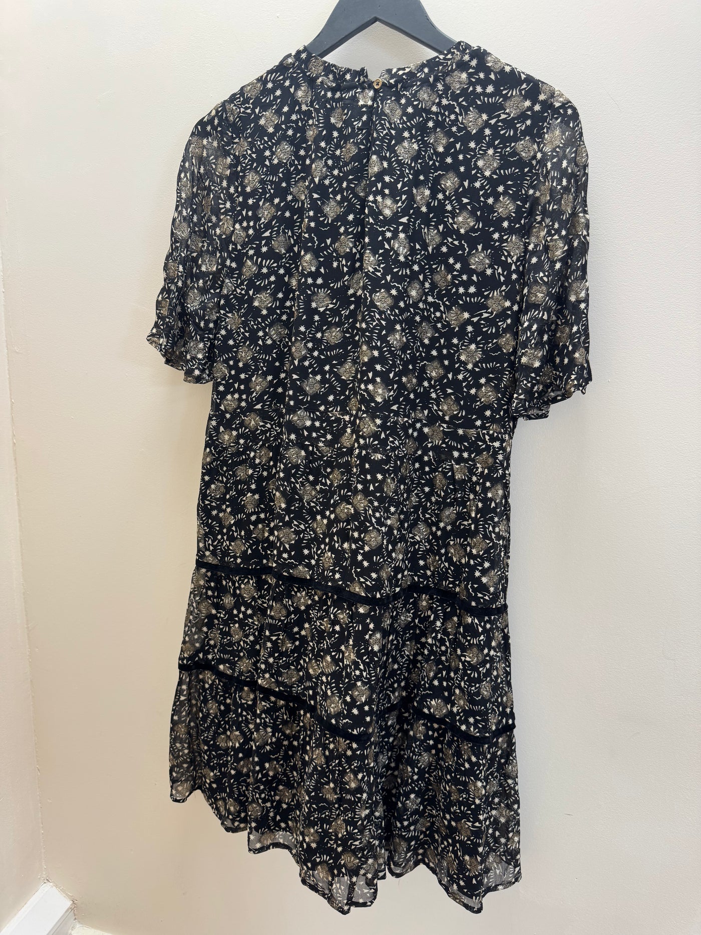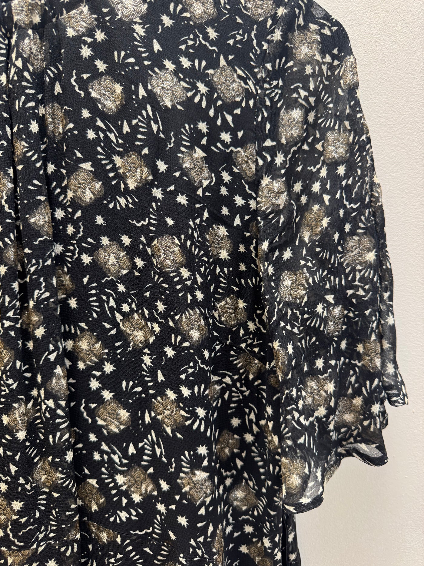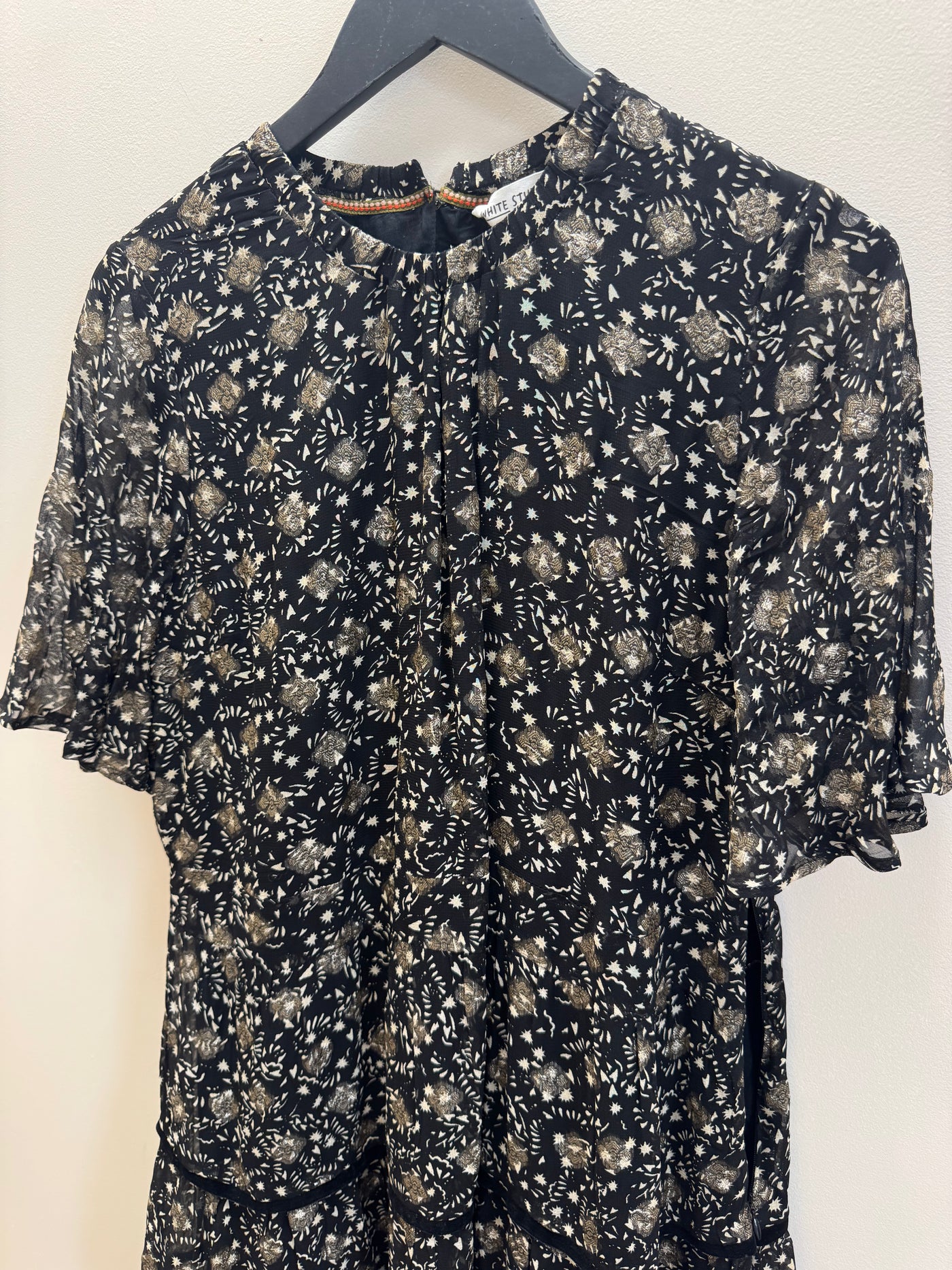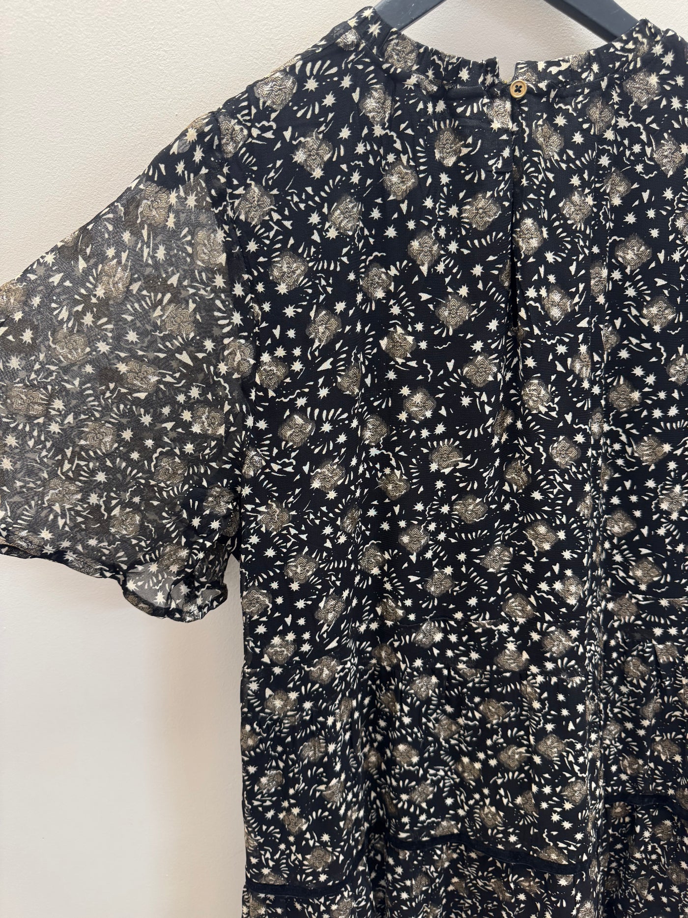 Features: Black base with gold print Soft, floaty silhouette Short sleeves Tiered hem detail Lightweight with subtle shimmer