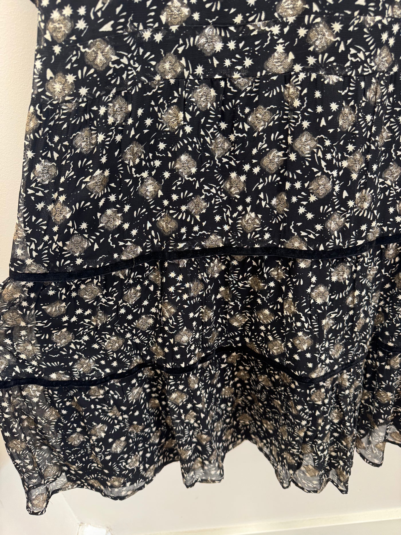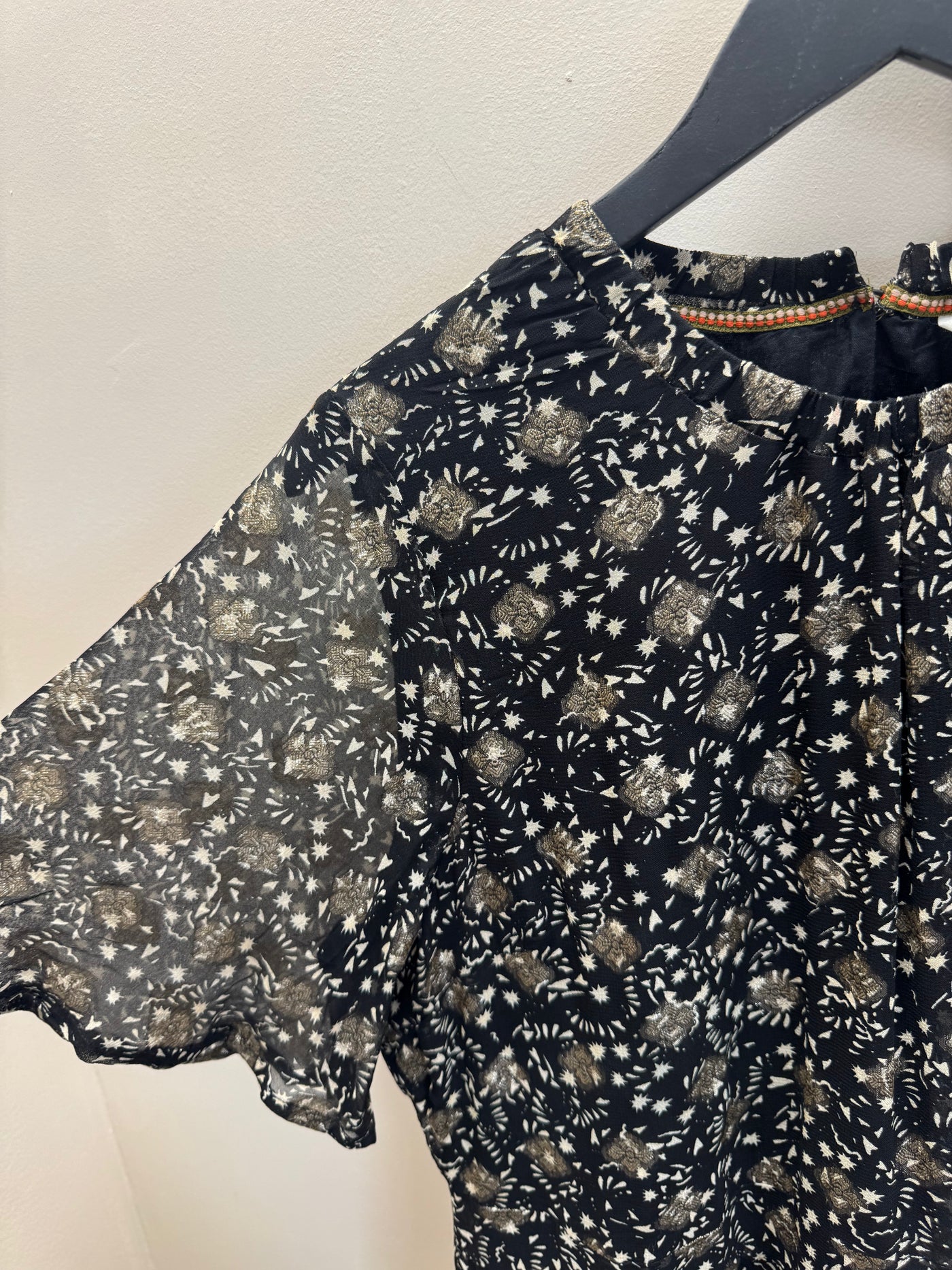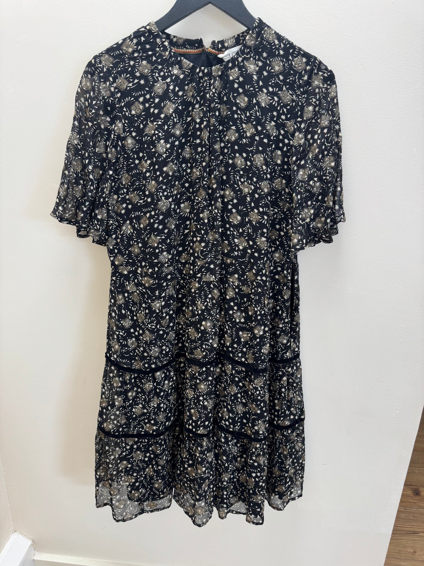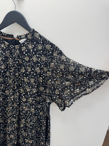 Features: Black base with gold print Soft, floaty silhouette Short sleeves Tiered hem detail Lightweight with subtle shimmer