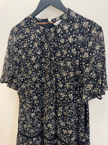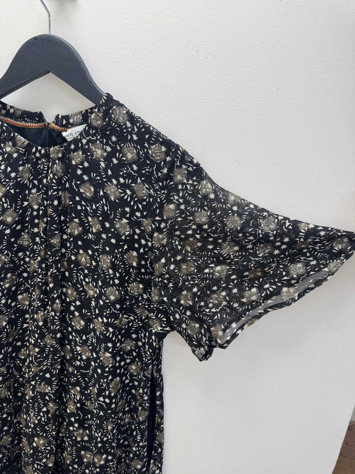 A floaty White Stuff dress in a delicate black and gold print, designed with a soft silhouette and subtle shimmer throughout. Lightweight and easy to wear, this piece brings effortless elegance to both day and evening styling.