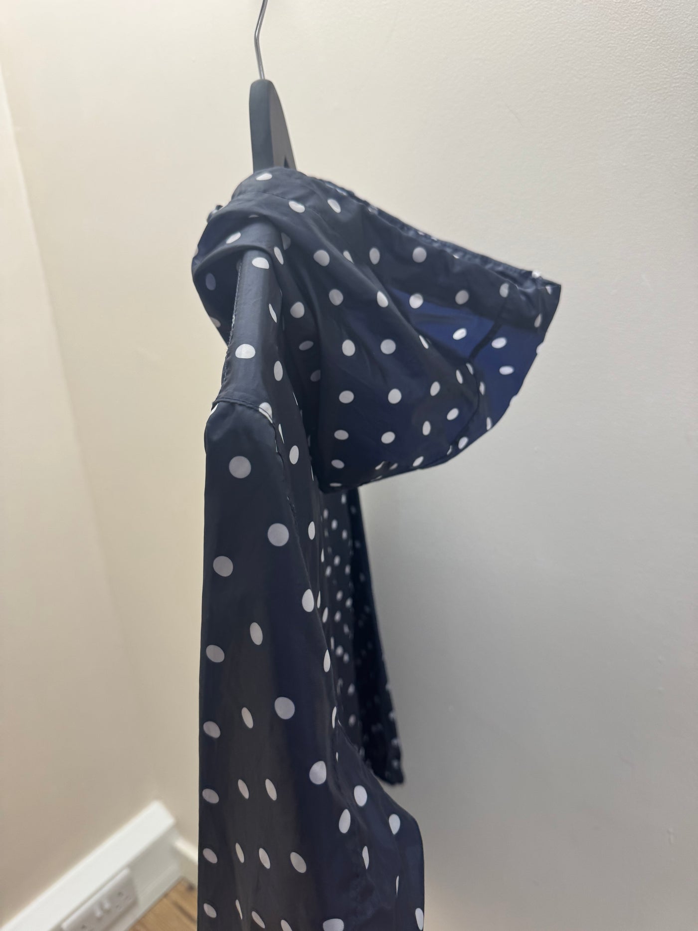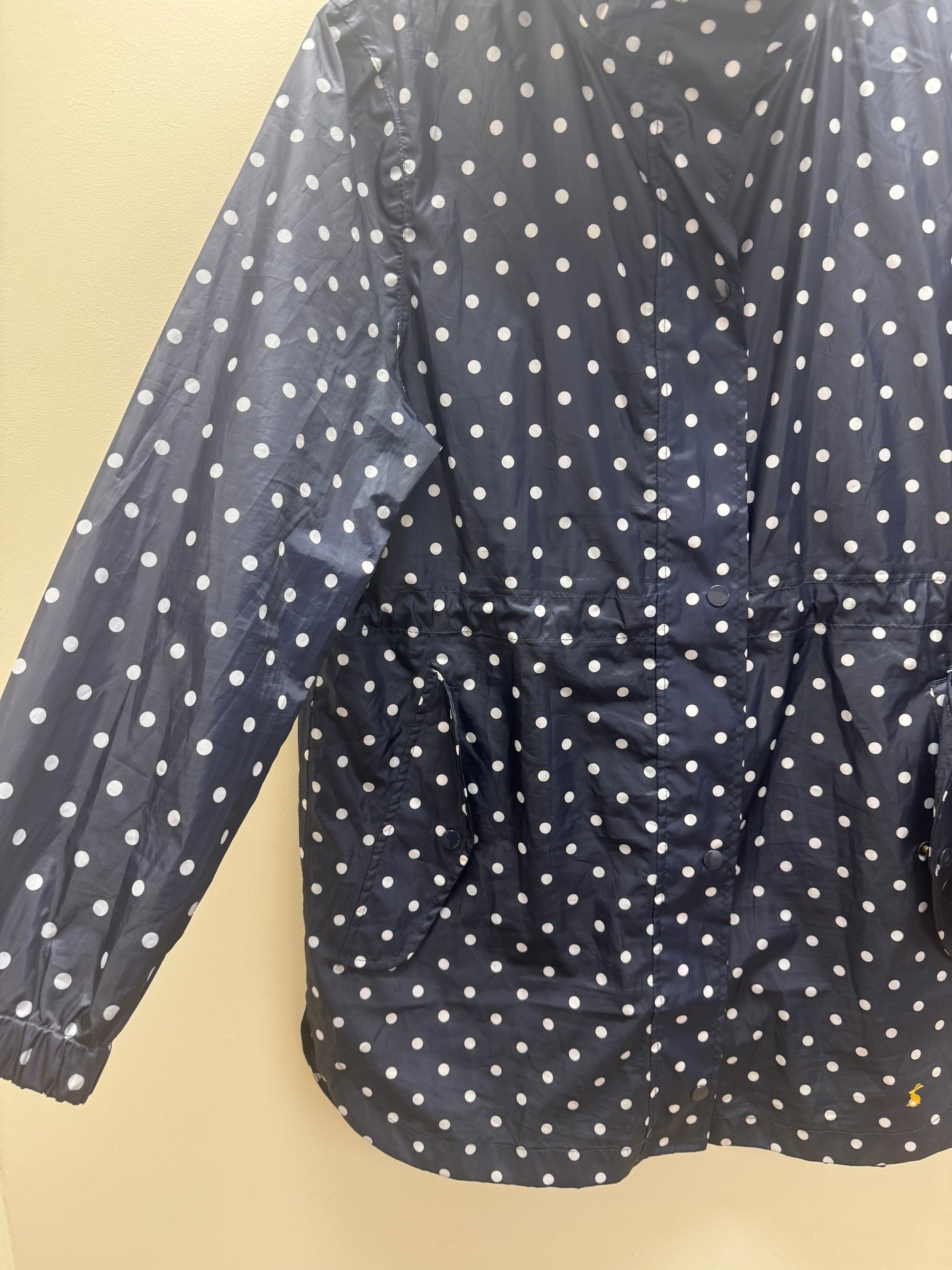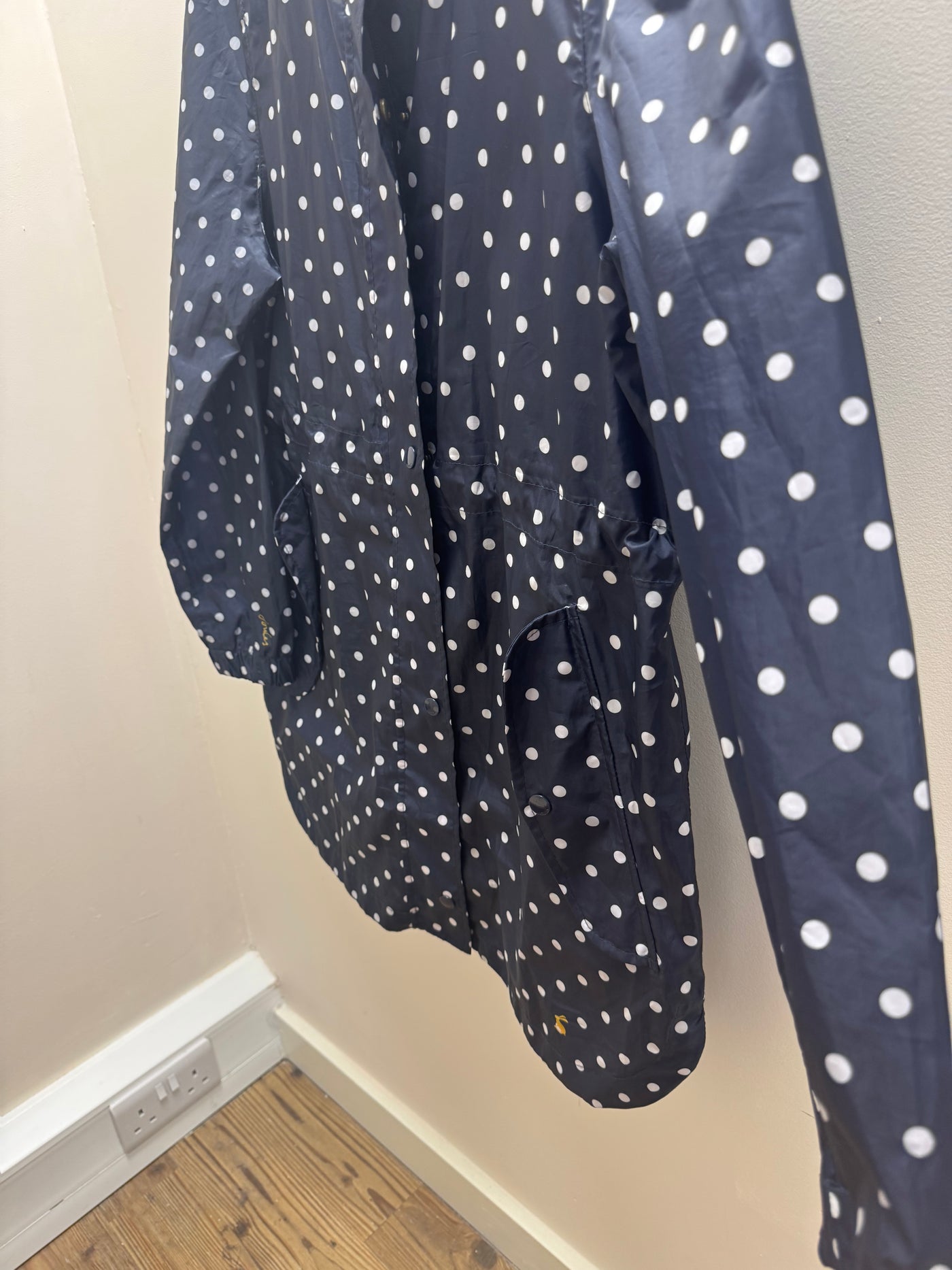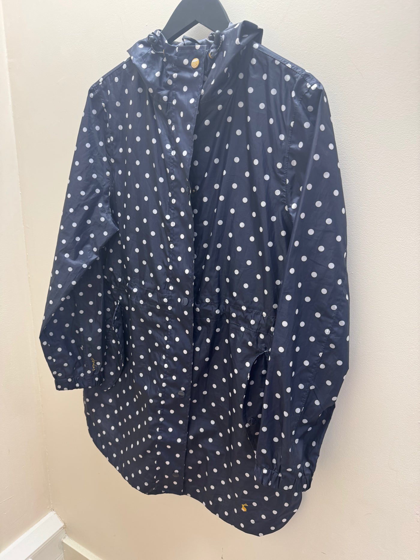 A classic Joules coat in a navy base with a playful white polka dot print, combining practicality with signature British charm. Lightweight yet functional, this piece is perfect for everyday wear and transitional weather.