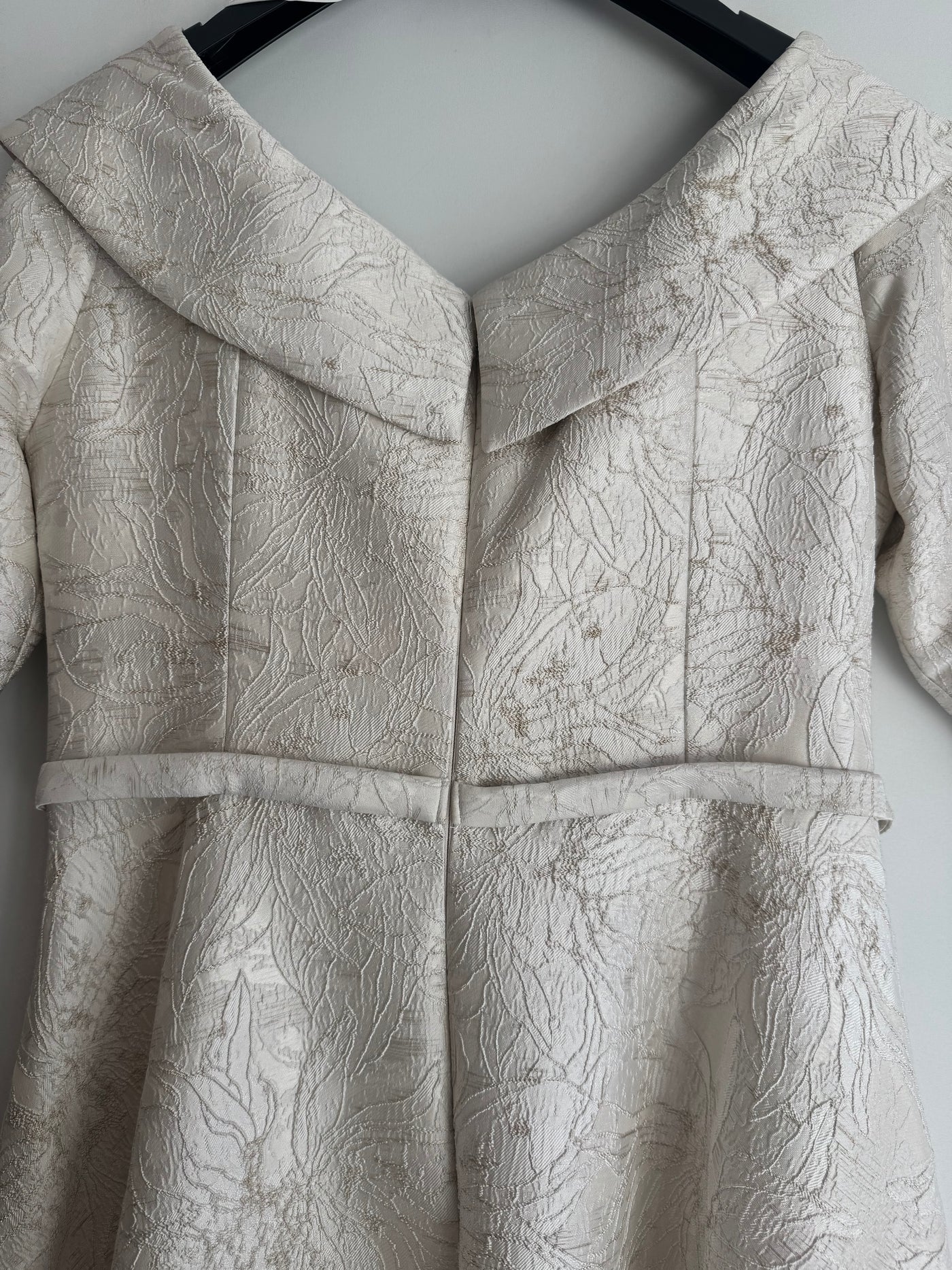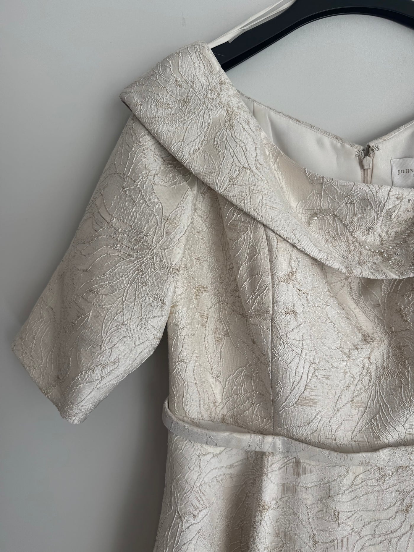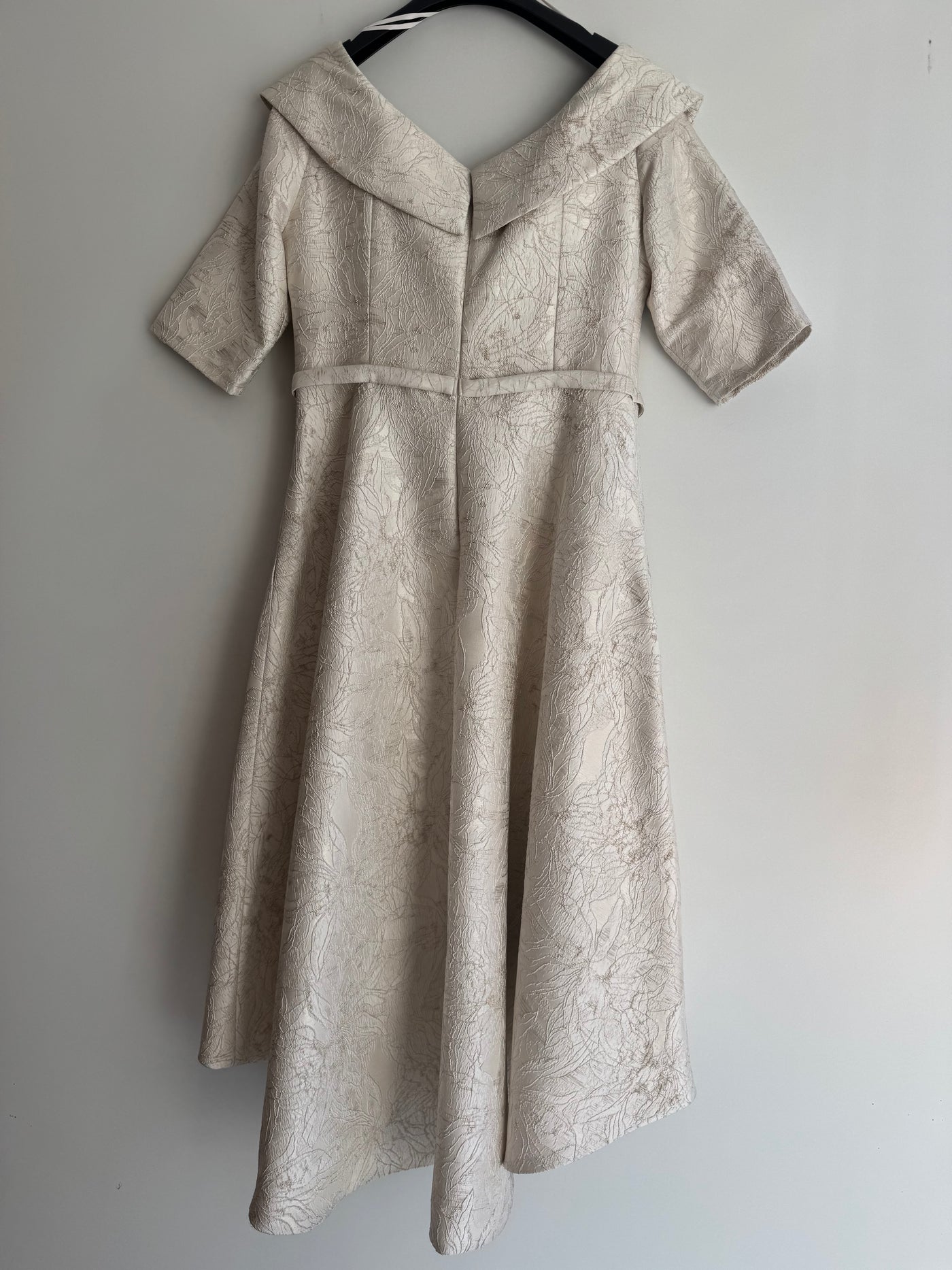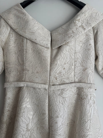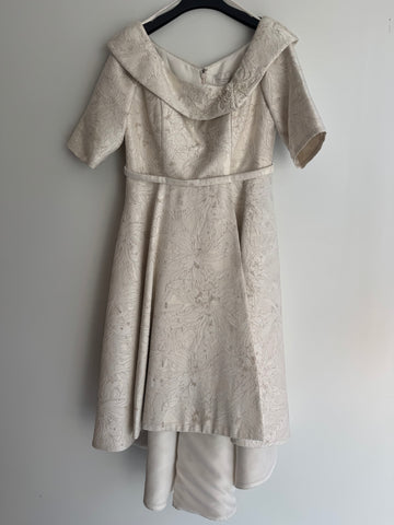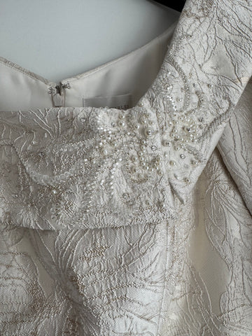 Make a statement in this exquisite preloved John Charles jacquard occasion dress. The distinctive high-low hemline adds visual interest, while the asymmetric neckline features delicate beaded embellishment for added glamour. Ideal for weddings, formal events and milestone celebrations, this dress is both elegant and sophisticated.
