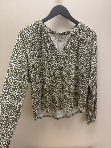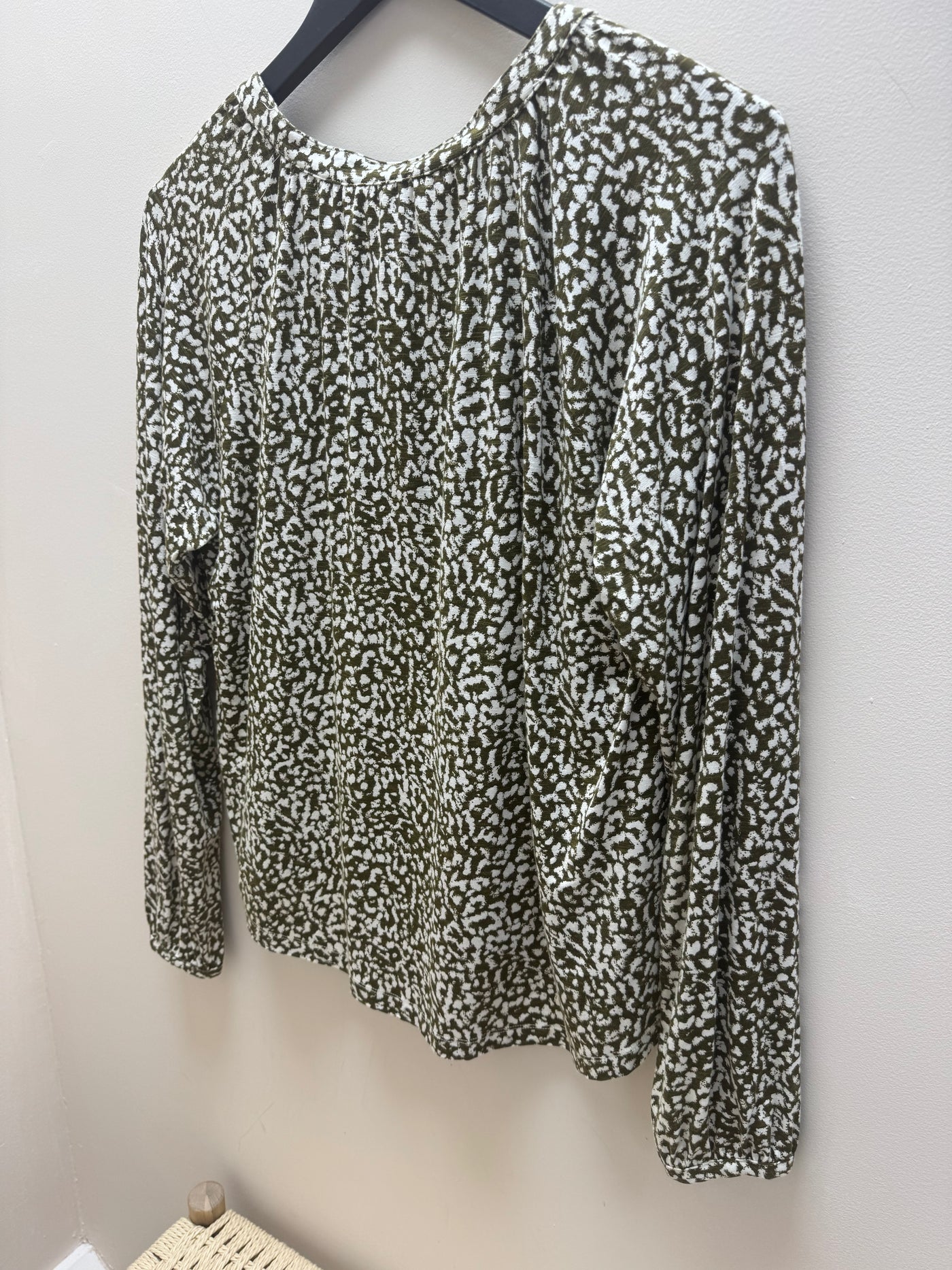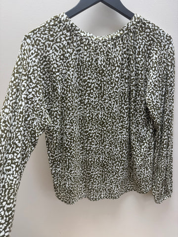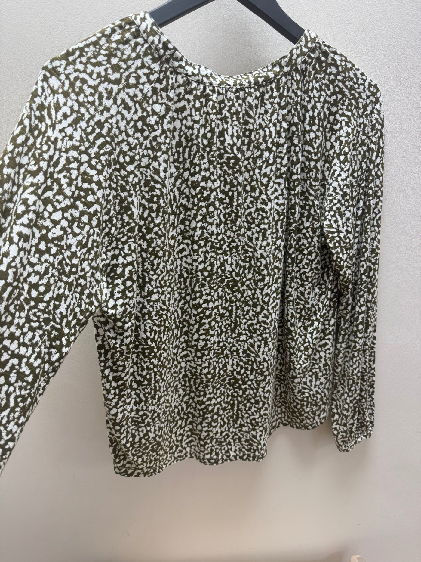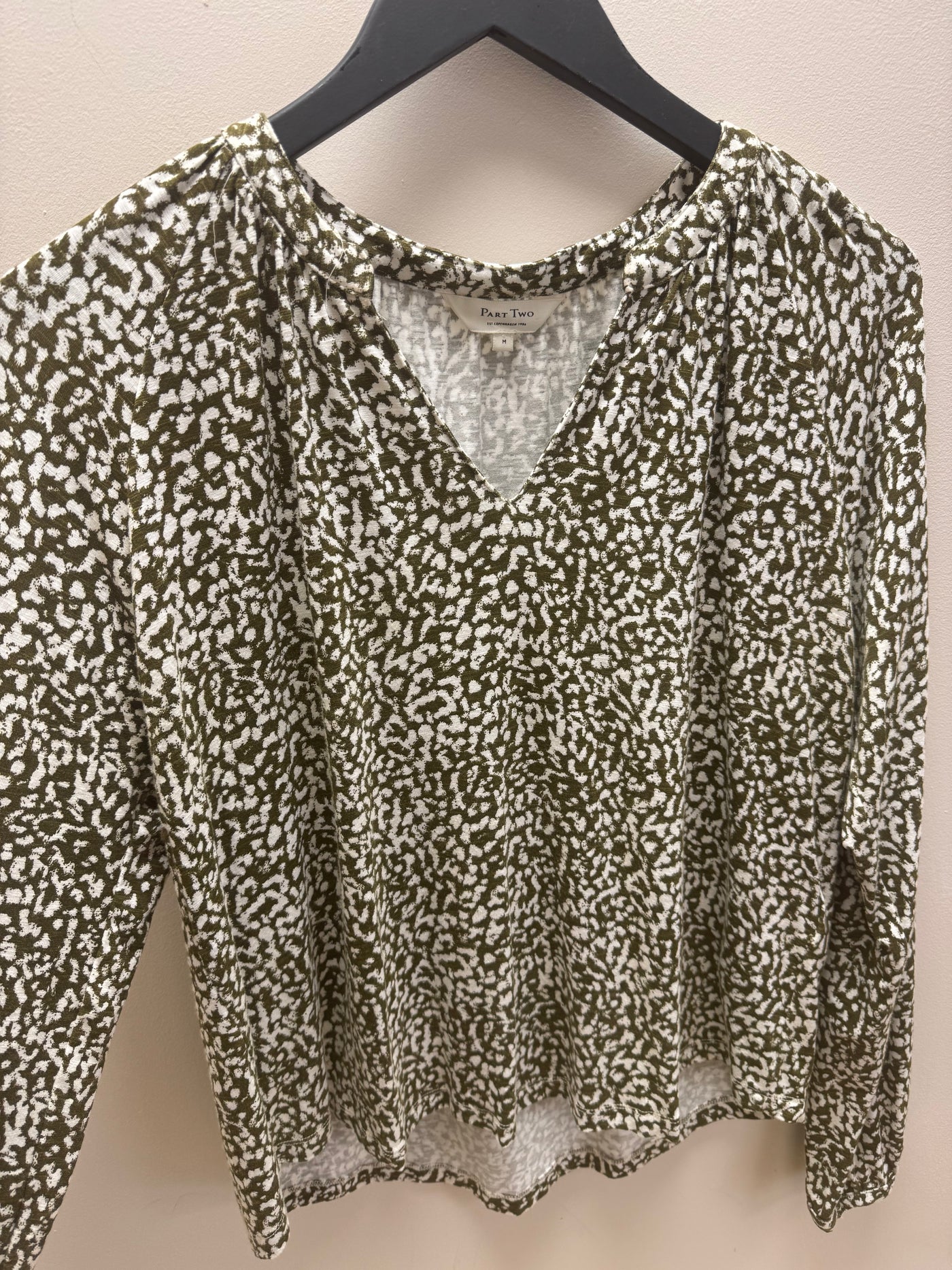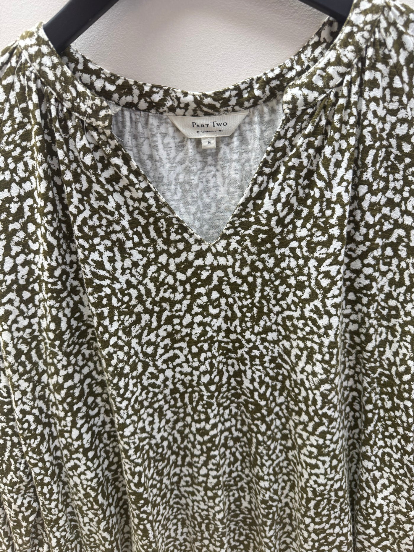 A soft and easy-to-wear Part Two blouse in a muted green print, perfect for everyday styling with a relaxed yet flattering fit.