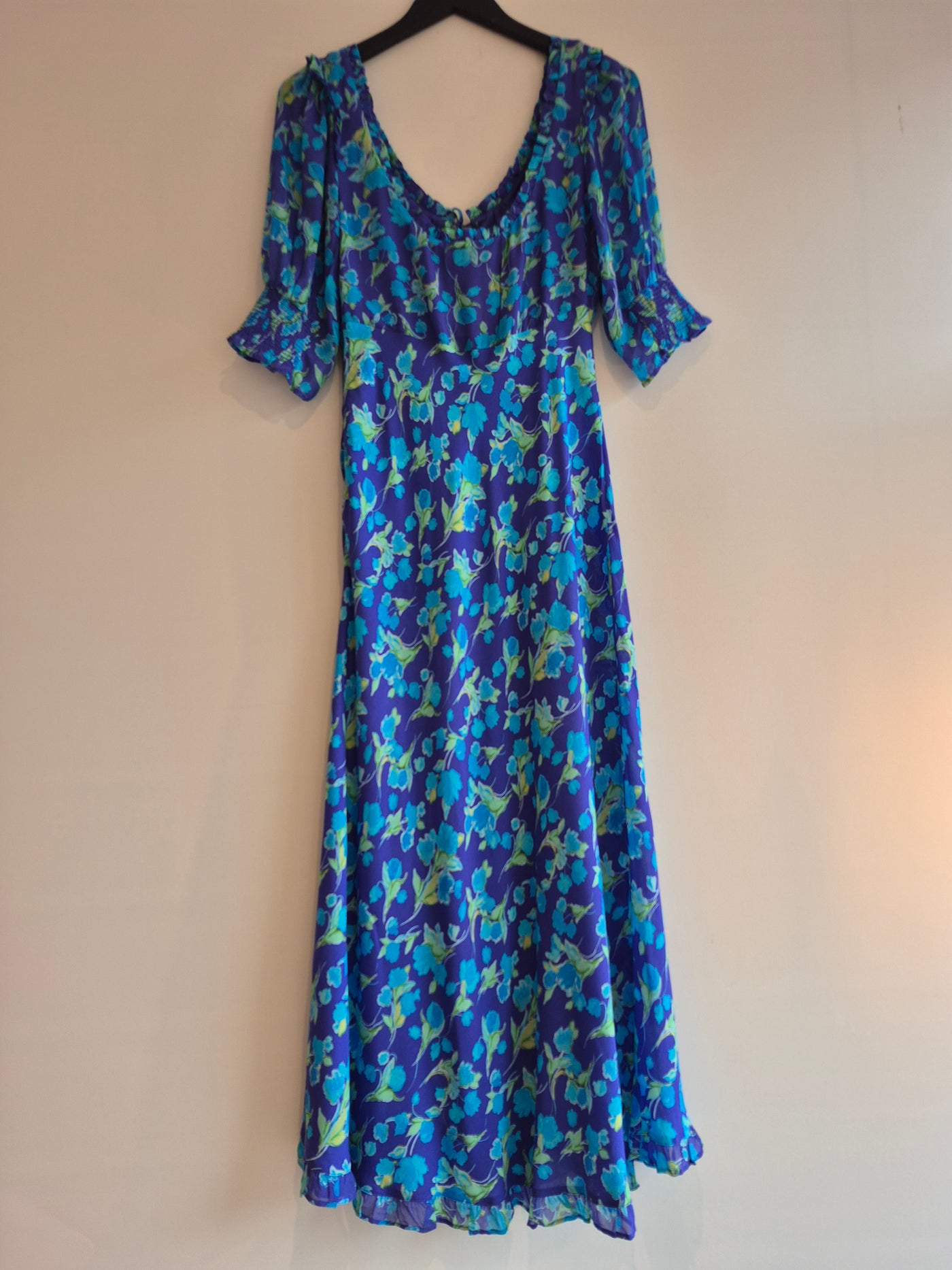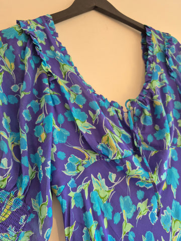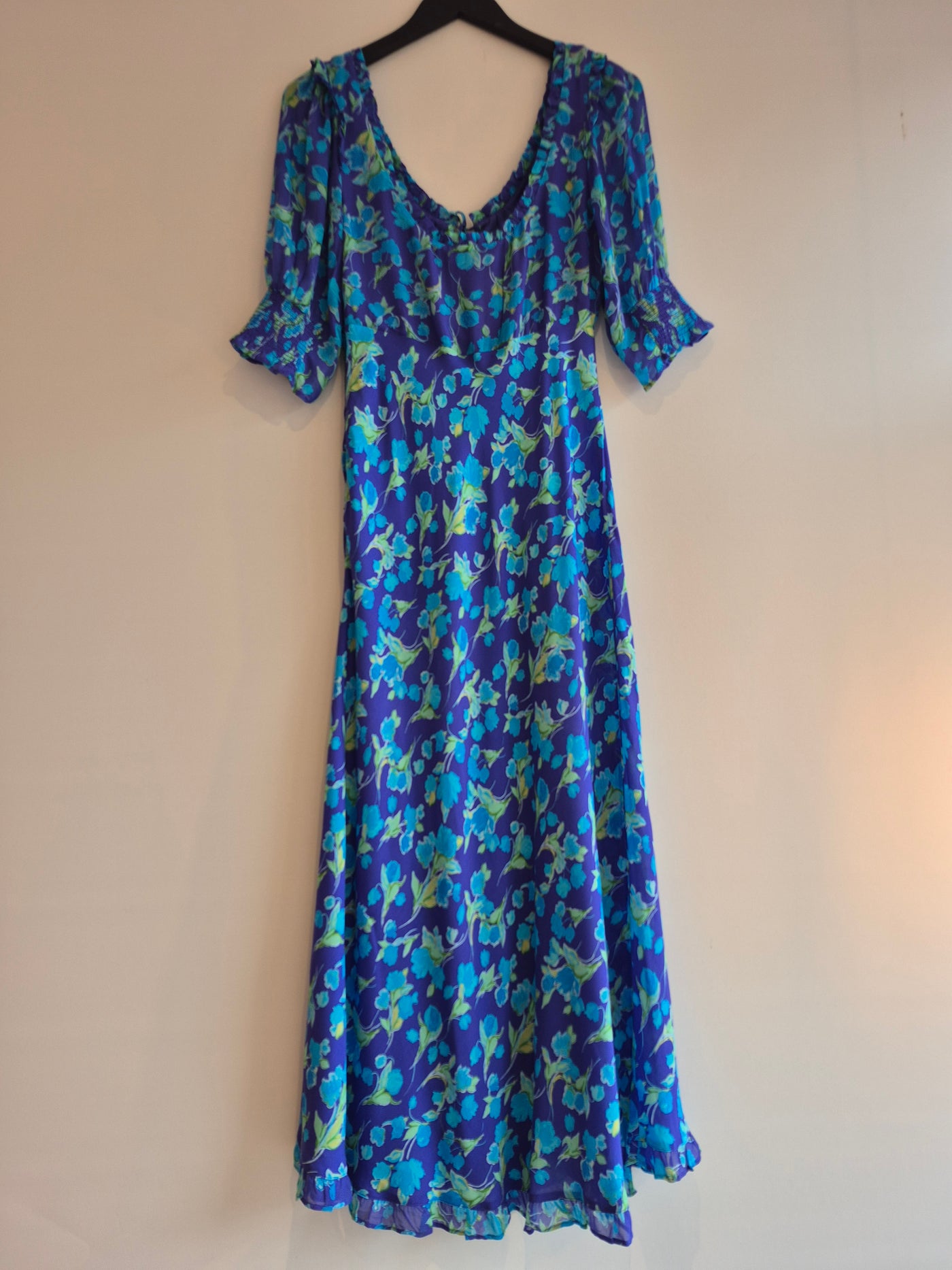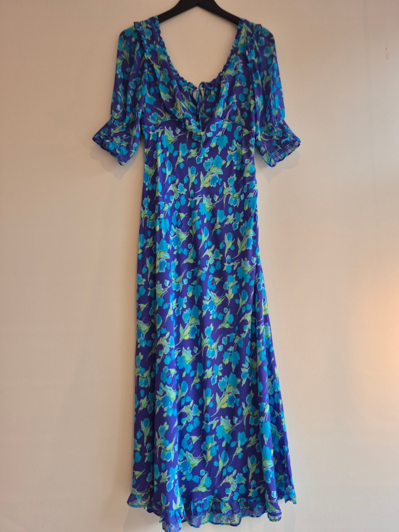 This gorgeous, flattering midi dress is the perfect choice for those summer special occasions. We believe this to be the popular 'Sathya' style from Rixo, a British contemporary womenswear brand. In a vibrant colour combination of blues and greens it features delicate puff sleeves with shirred detail and frilled hem for an ultra feminine look.