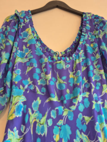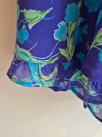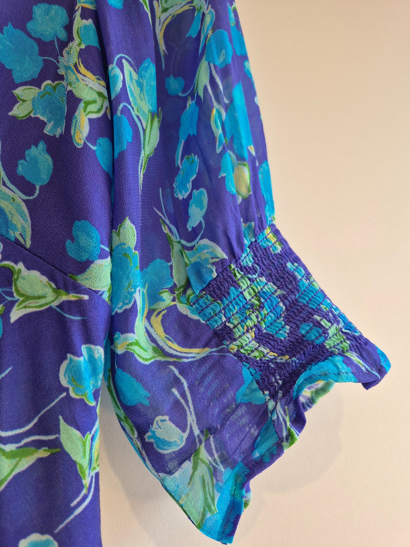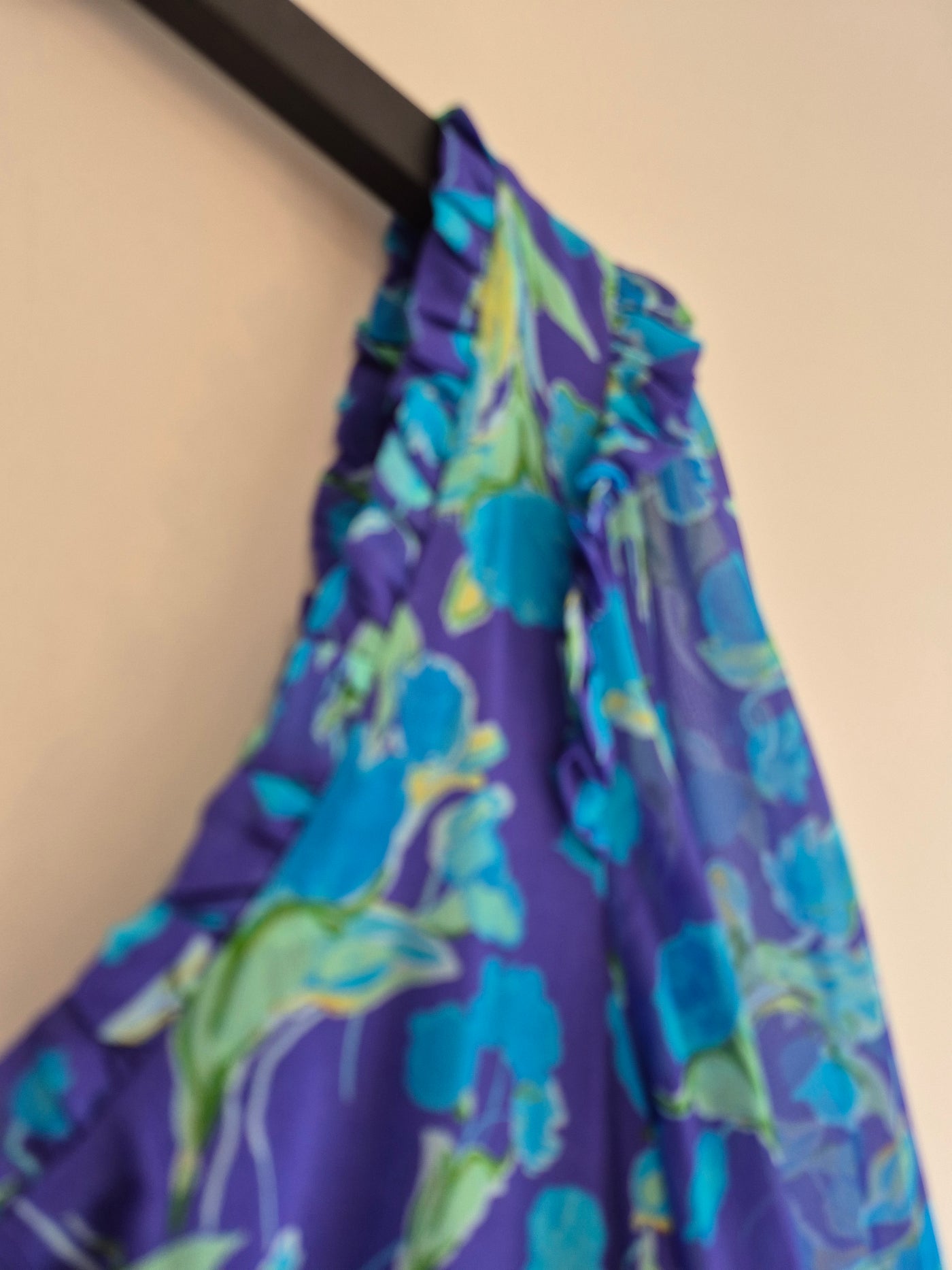 This gorgeous, flattering midi dress is the perfect choice for those summer special occasions. We believe this to be the popular 'Sathya' style from Rixo, a British contemporary womenswear brand. In a vibrant colour combination of blues and greens it features delicate puff sleeves with shirred detail and frilled hem for an ultra feminine look.