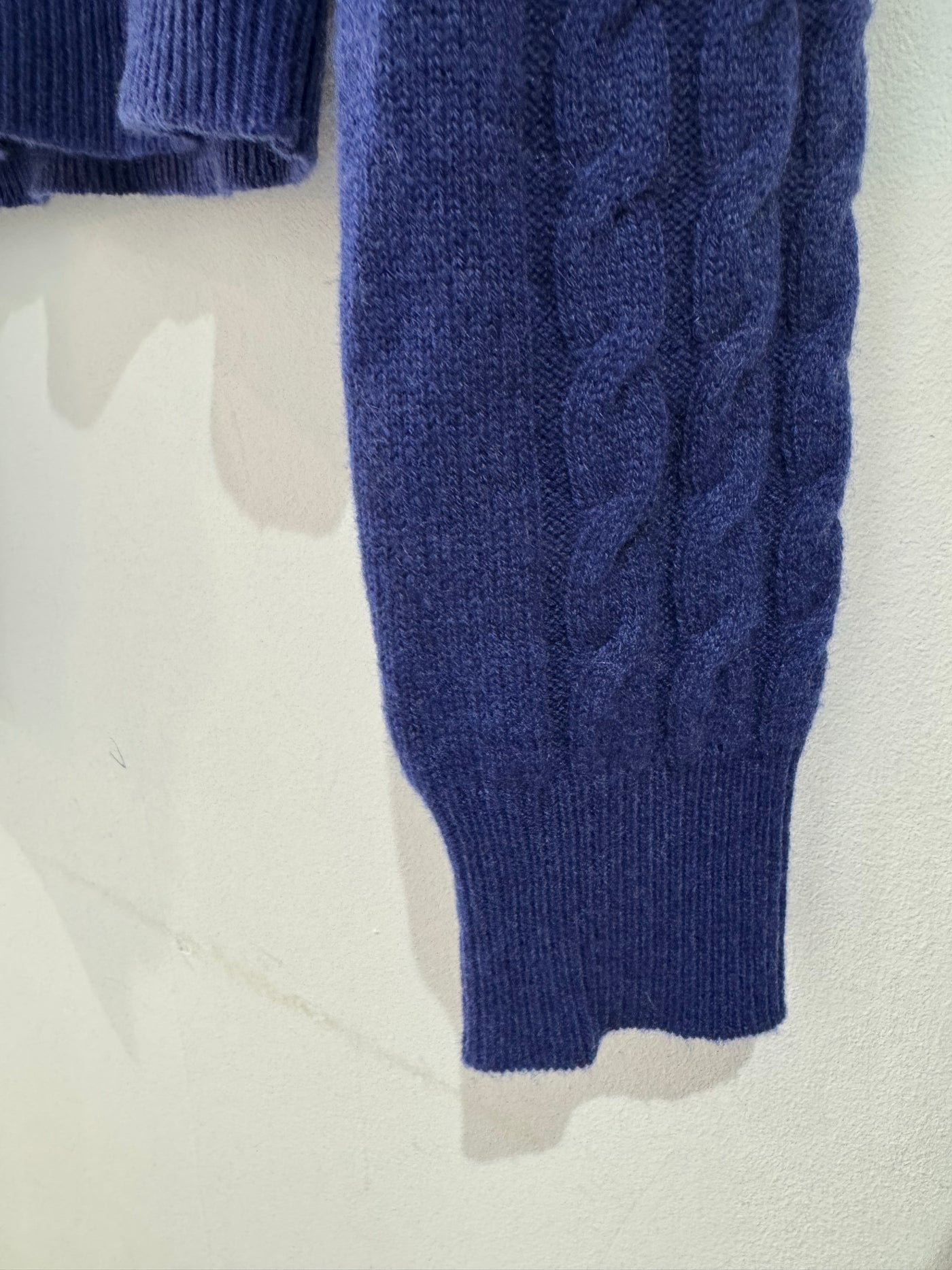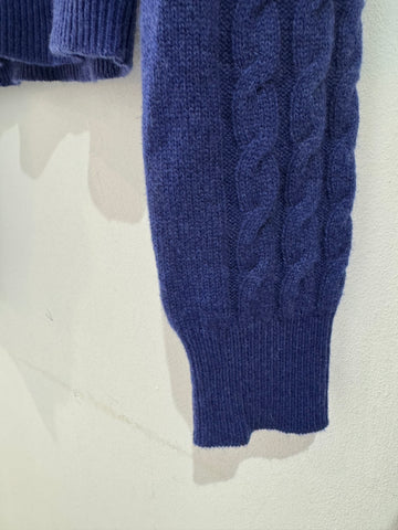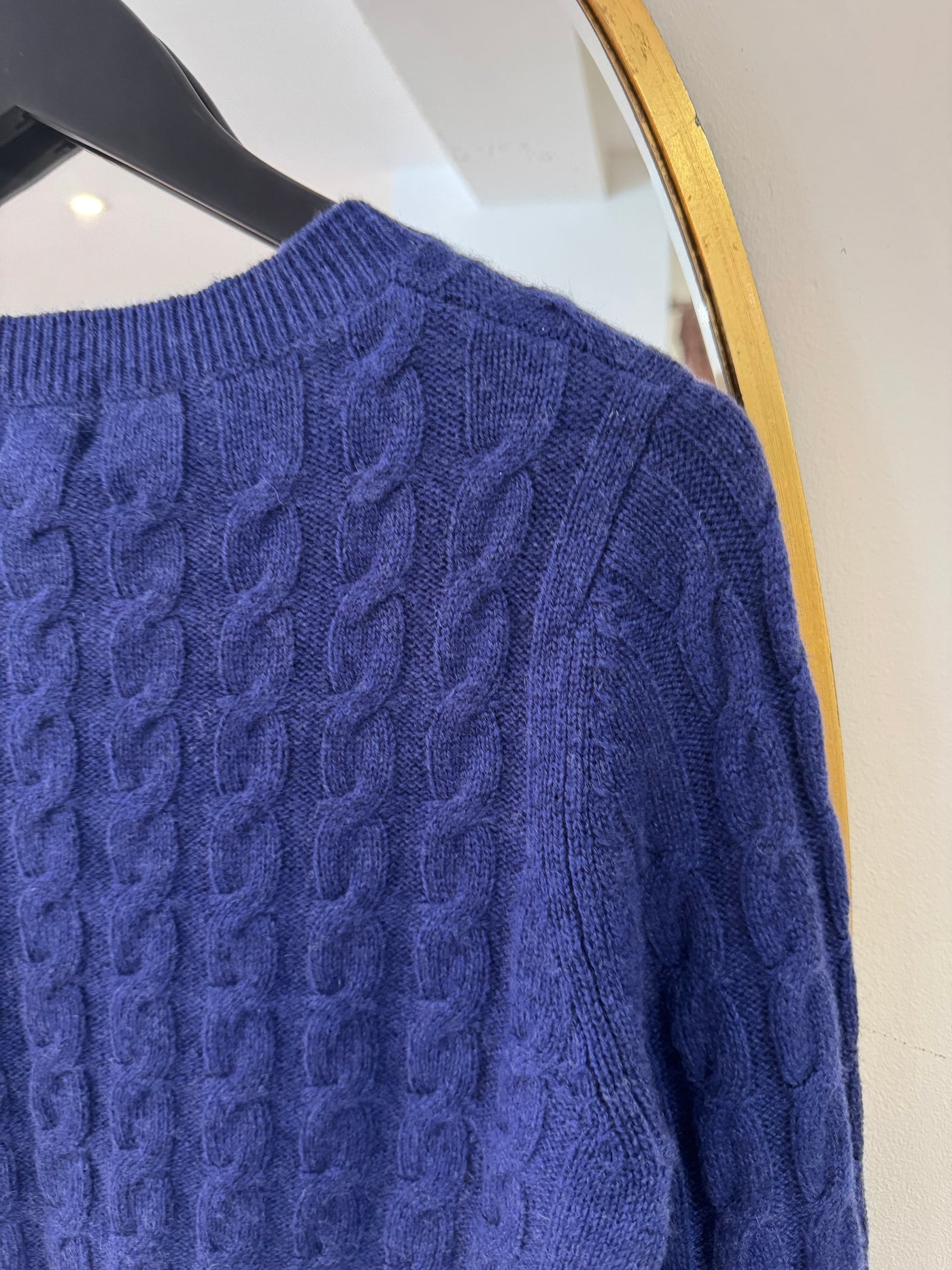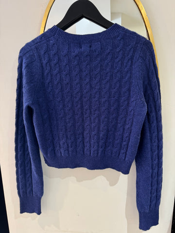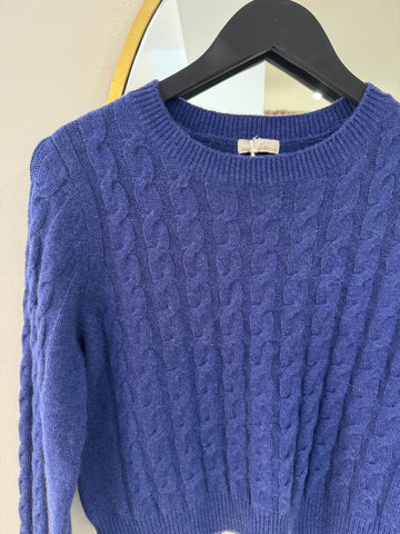 A lovely crop cable design Cashmere sweater, in this lovely shade of Blue. New with tags.