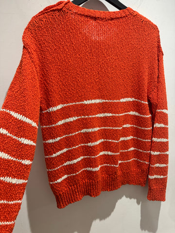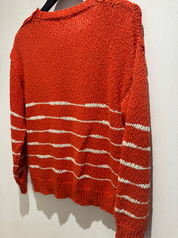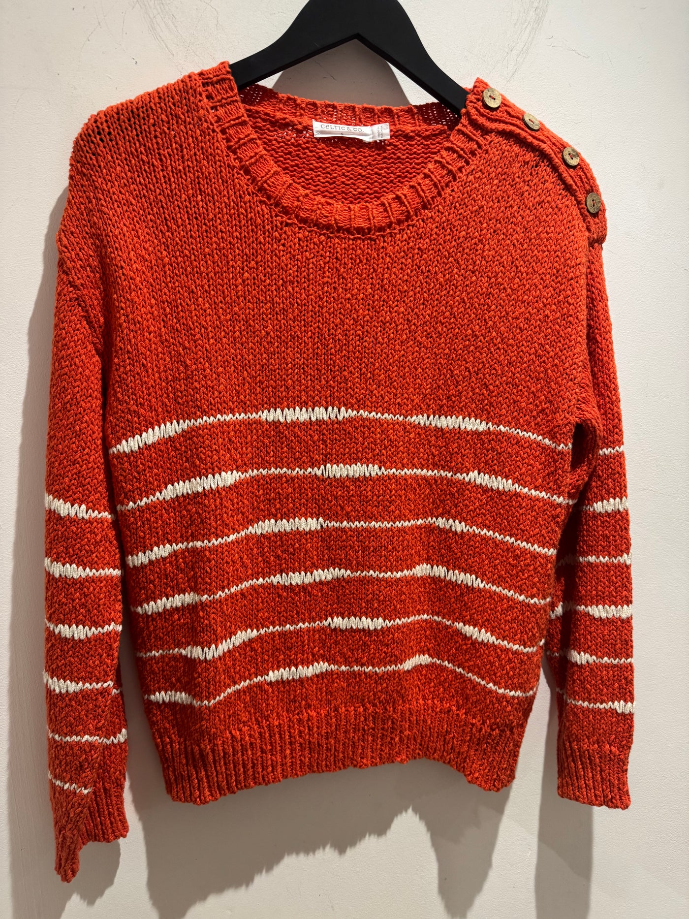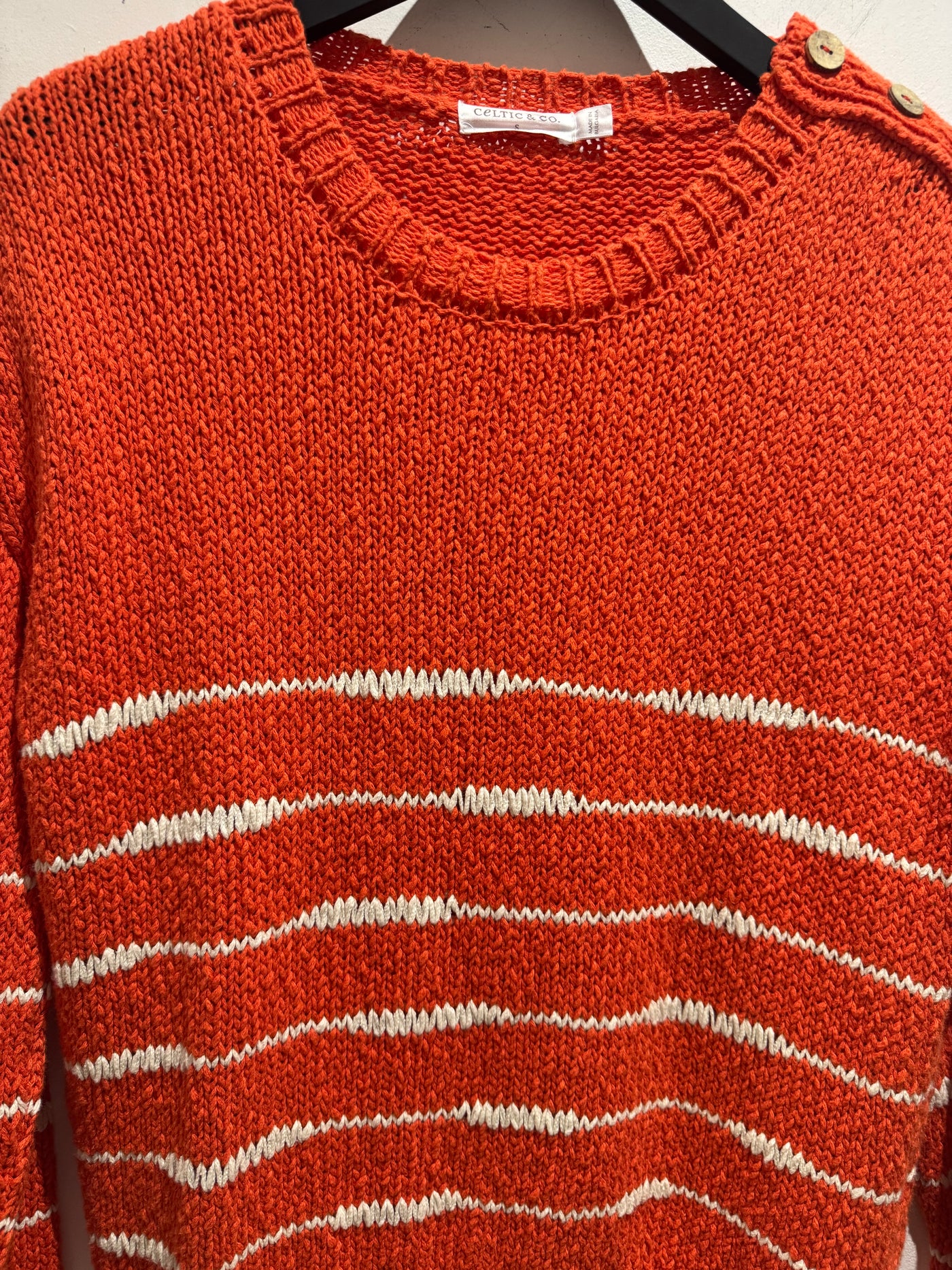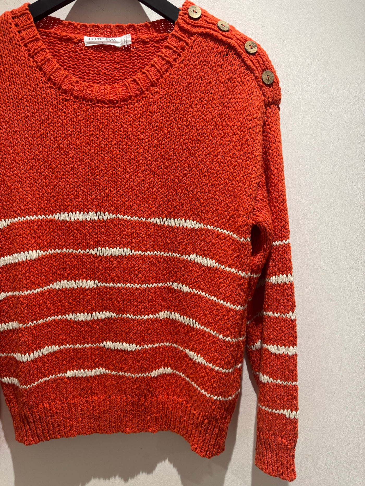 Bright and breathable Celtic & Co jumper in an orange and white stripe design. A relaxed knit with shoulder button detail, perfect for easy, everyday wear.